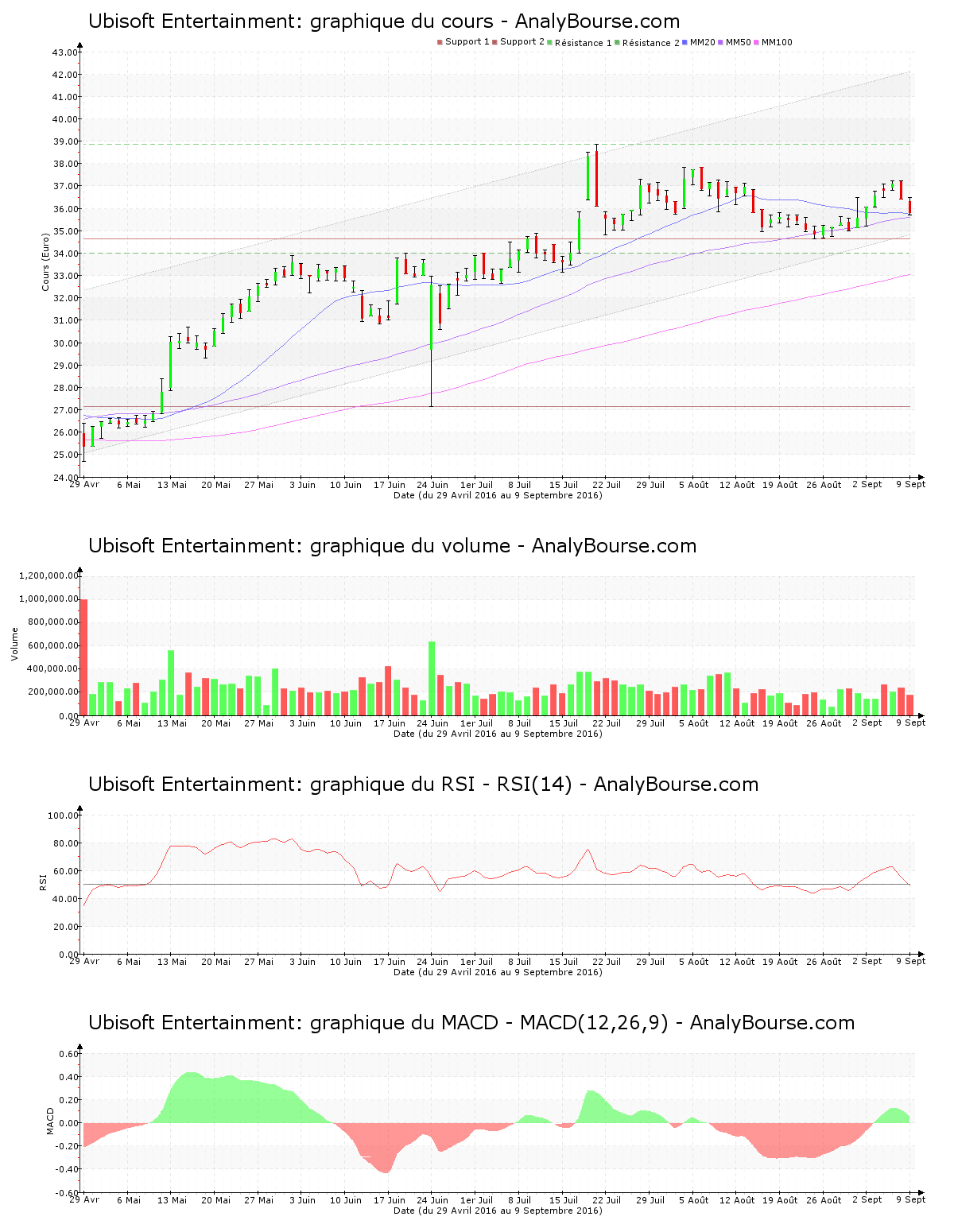 Ces informations constituent une analyse technique de la valeur Ubisoft Entertainment au dimanche 11 septembre 2016. Cette analyse peut être invalidée par des éléments plus récents, et ne constitue en aucune manière une incitation d’achat ou de vente sur les marchés financiers. Le lecteur reste libre et responsable de l’interprétation et de l’usage faits de ces informations.