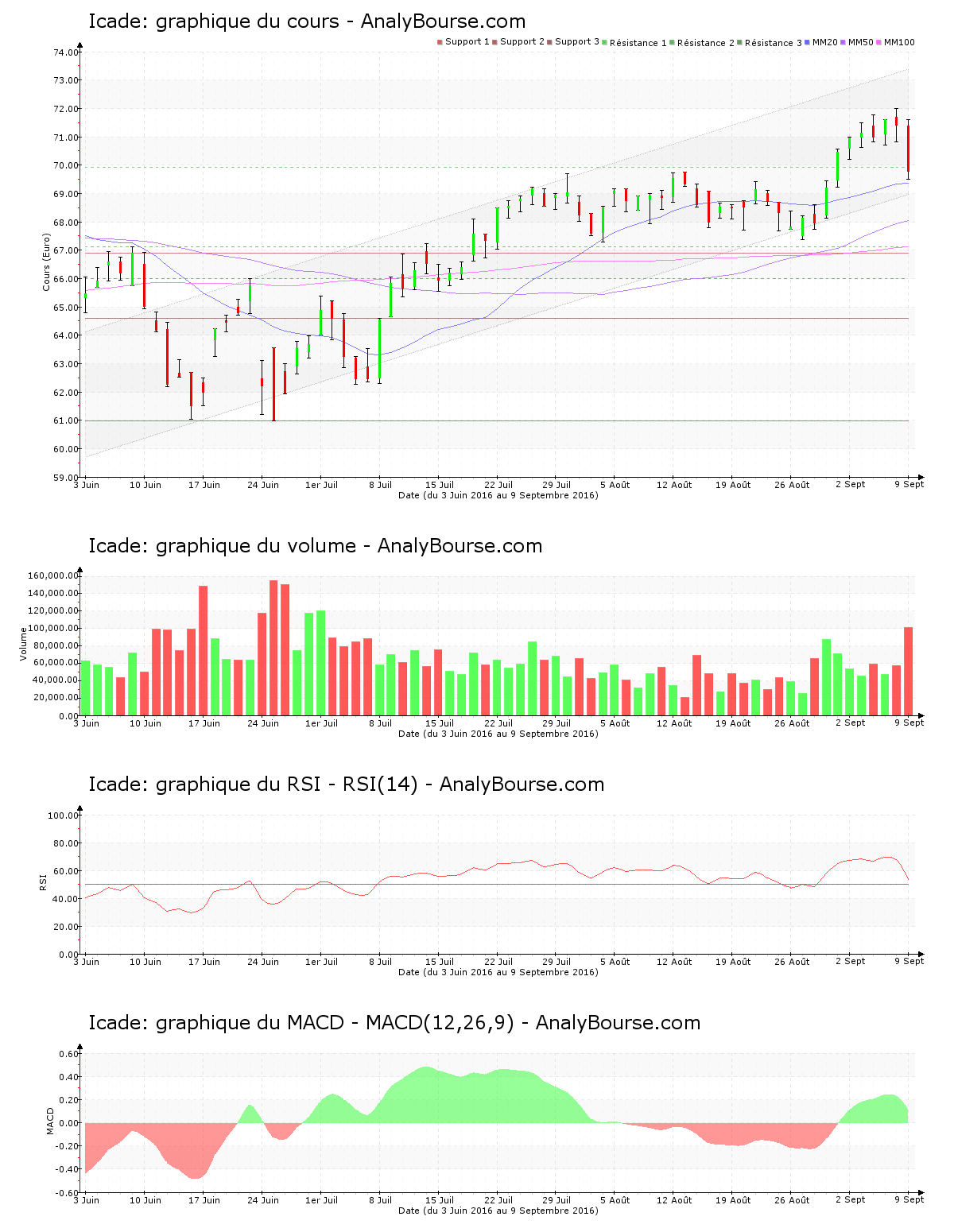Ces informations constituent une analyse technique de la valeur Icade au dimanche 11 septembre 2016. Cette analyse peut être invalidée par des éléments plus récents, et ne constitue en aucune manière une incitation d’achat ou de vente sur les marchés financiers. Le lecteur reste libre et responsable de l’interprétation et de l’usage faits de ces informations.