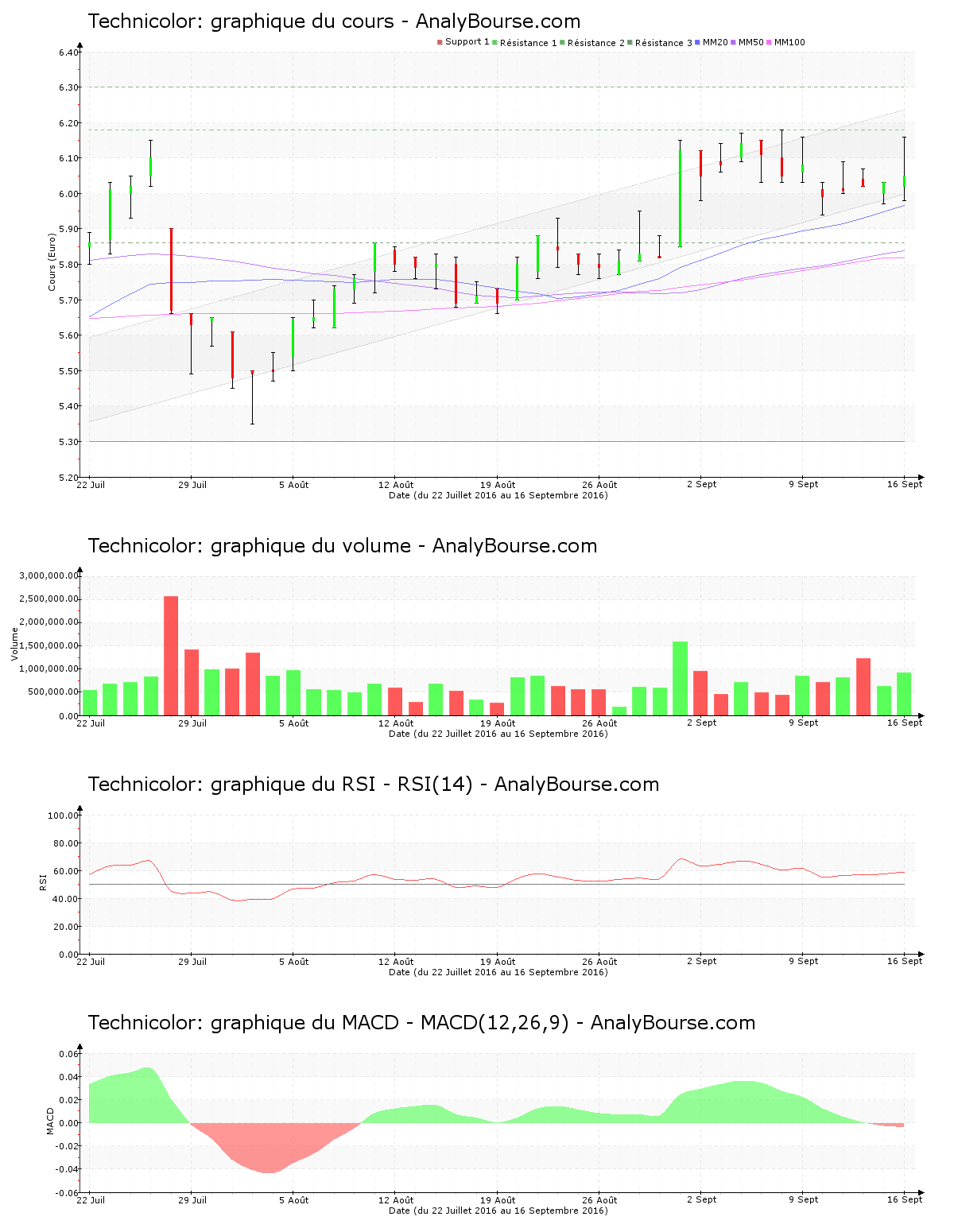 Avec un cours baissier de 0.49%, le constat est toujours neutre ces dernières séances pour Technicolor. La valeur Technicolor était déjà la semaine dernière relativement peu sollicitée, avec un développement assez stable de 0.50%. Cette dernière se valorise ainsi finalement à 6.050 €. L’action se trouve dans la zone inférieure du canal à l’intérieur duquel elle s’enferme depuis plusieurs semaines.