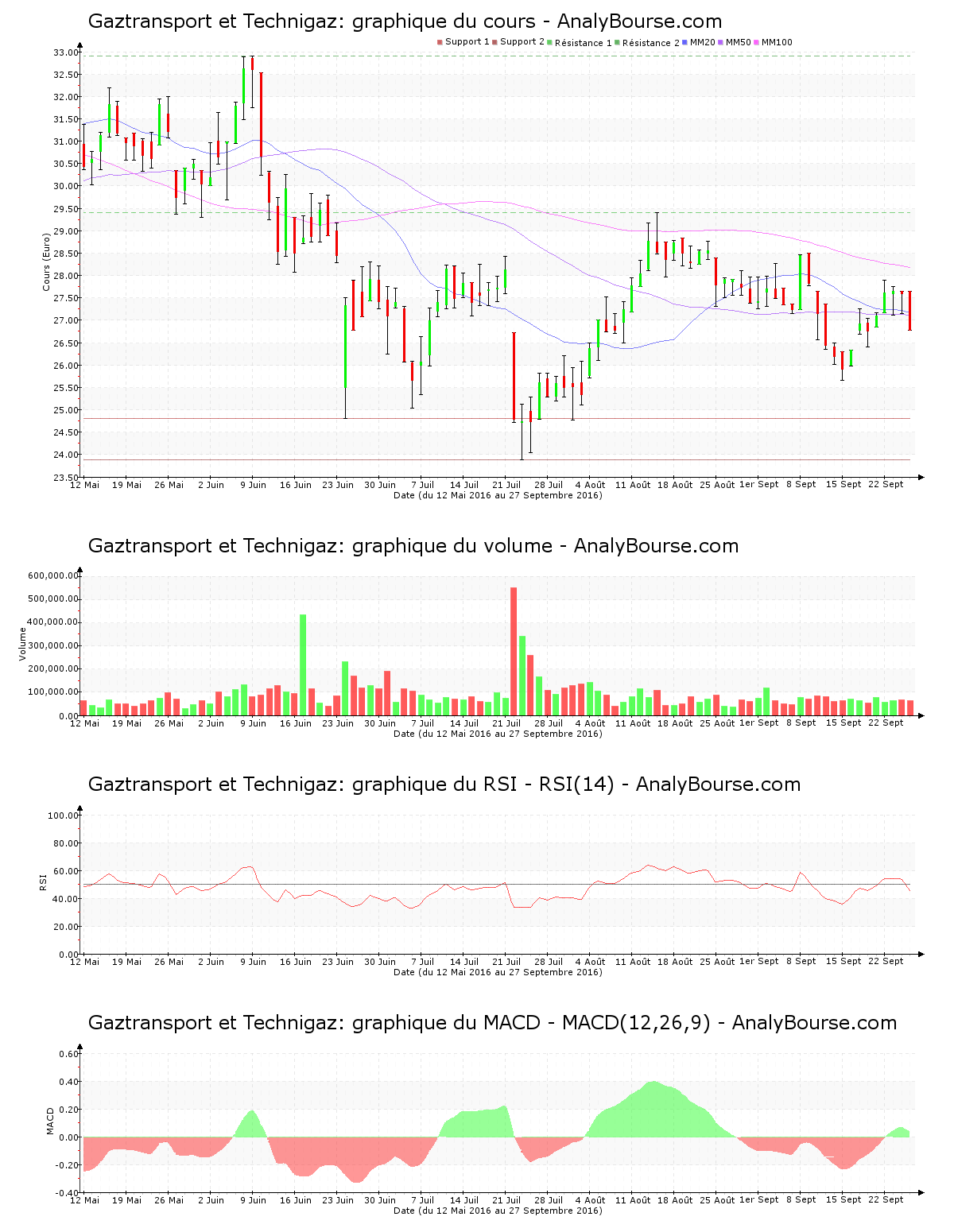 Du côté des indicateurs, en ce qui concerne l’indicateur RSI, on observe qu’il est en diminution ce mardi. Il a basculé dans le niveau de vente, ce qui pourrait révèler une amorce d’une trajectoire décroissante pour l’action Gaztransport et Technigaz sur le long terme.