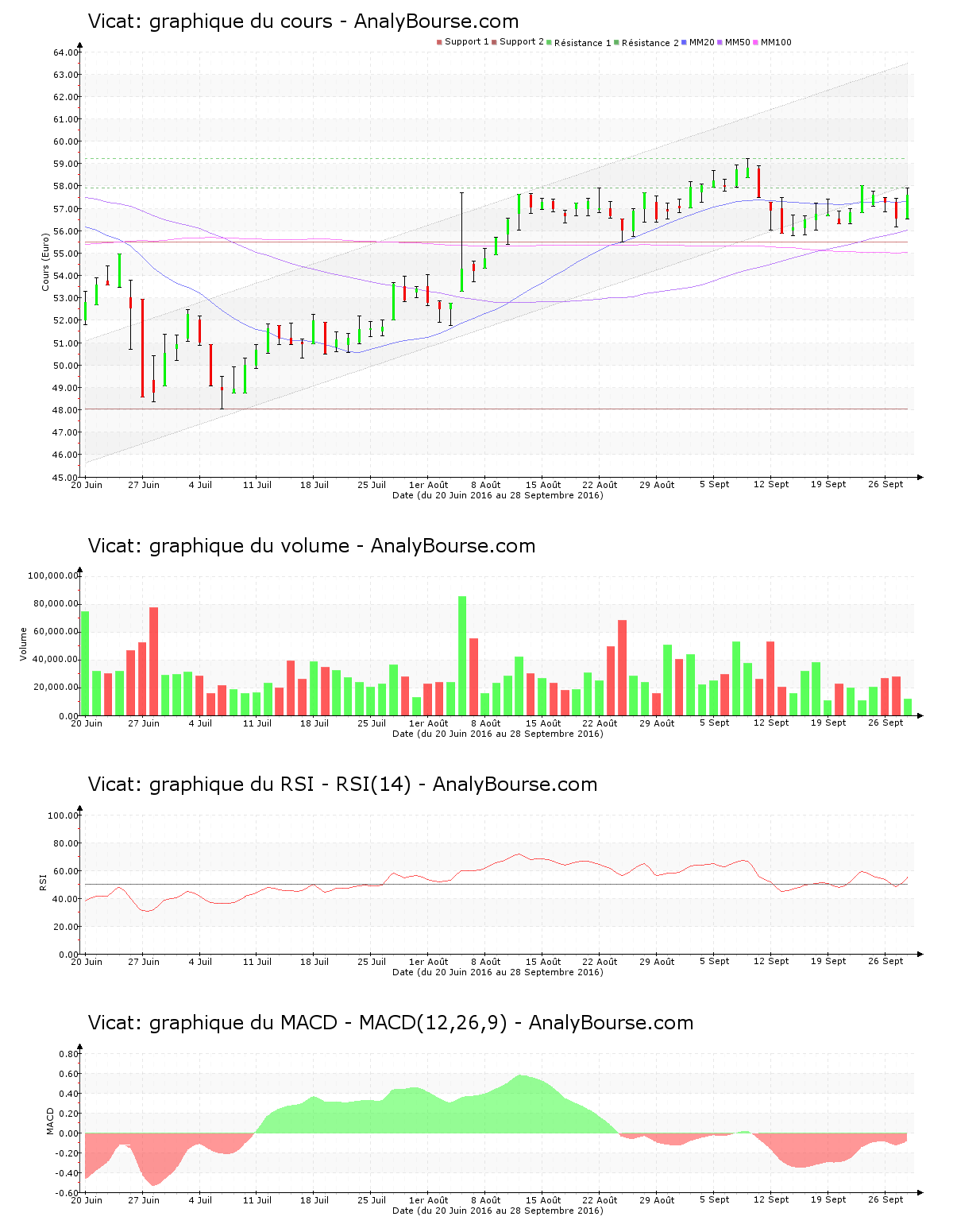 En ce qui concerne les indicateurs, concernant l’indicateur RSI, on observe que ce dernier est en augmentation ce mercredi 28 septembre. Il a basculé dans le niveau d’achat, ce qui pourrait dévoiler une base d’une évolution haussière pour l’action Vicat sur la durée. Le MACD est en hausse ce mercredi 28 septembre. C’est malgré tout toujours une tendance du cours en substantielle régression que ce dernier révèle sur le moyen-court terme.