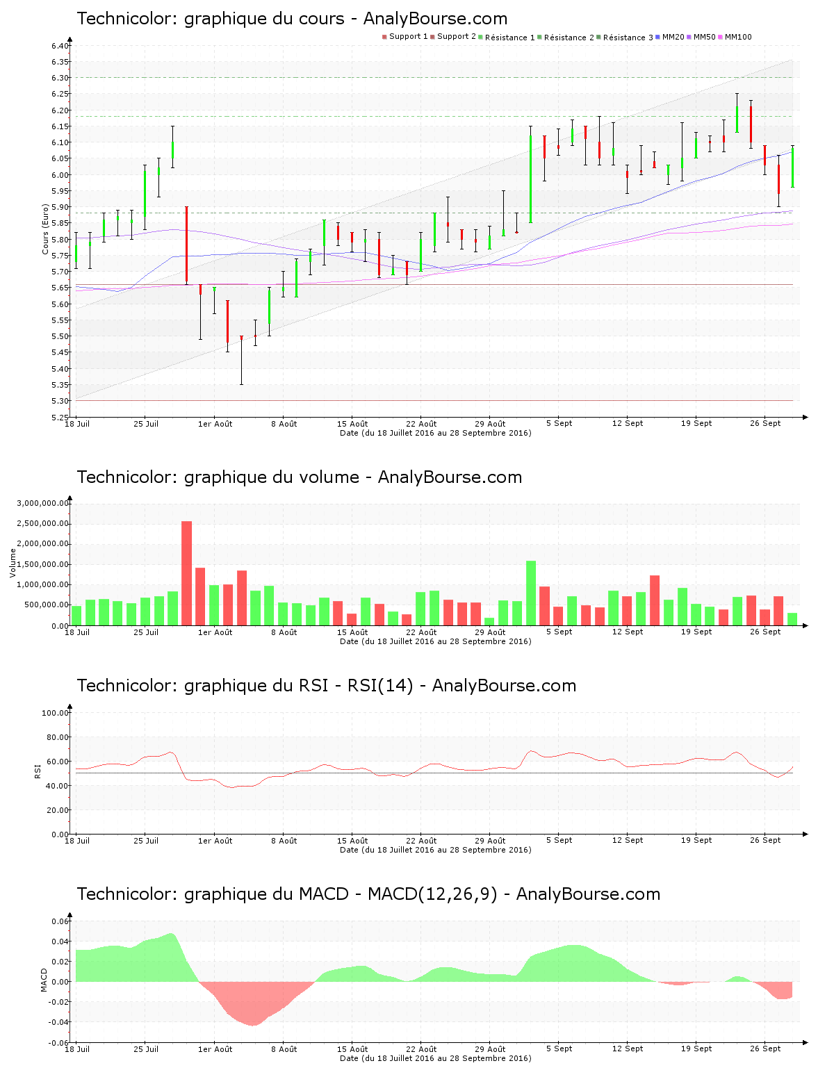 Le RSI est en progression ce mercredi 28 septembre. Il est passé dans le niveau d’achat, ceci pourrait indiquer une base d’une trajectoire haussière pour l’action Technicolor sur la durée.
