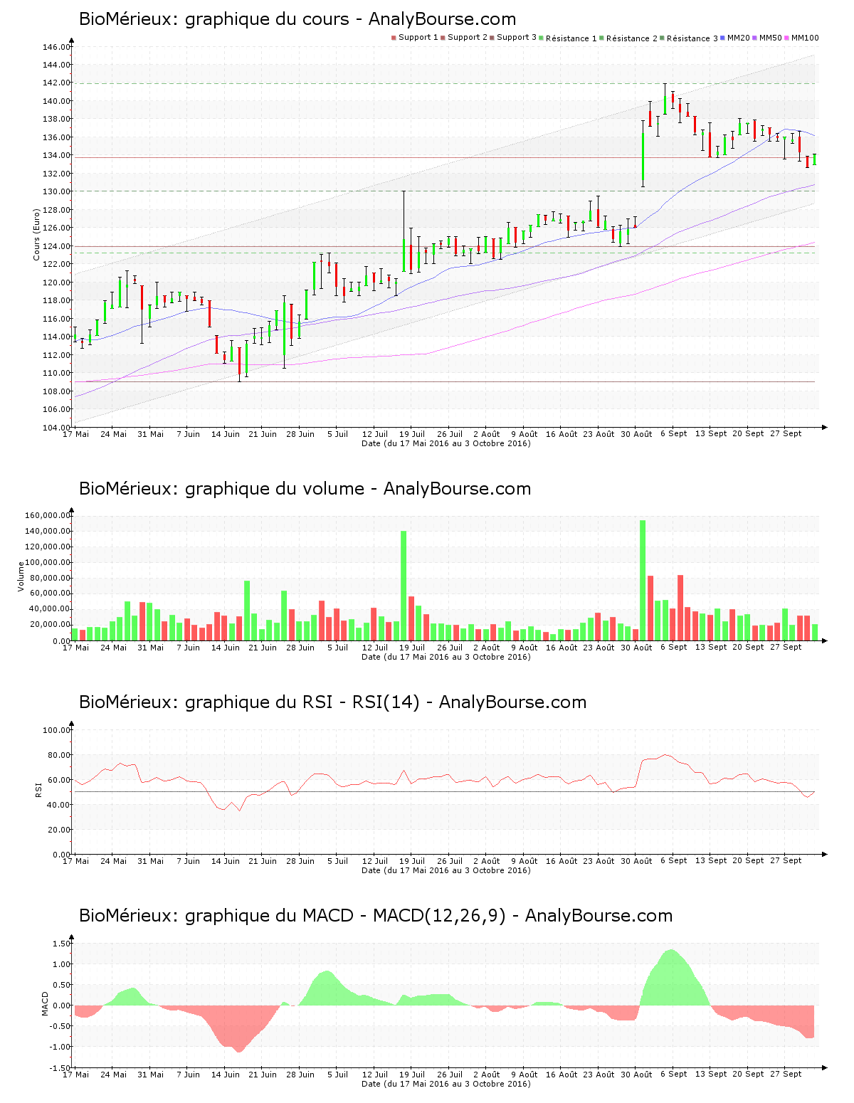 On observe qu’aujourd’hui le MACD est stable. Il dessine ainsi encore une trajectoire du cours en substantielle baisse à court-moyen terme. On remarque que ce lundi 3 octobre le RSI est en croissance. Il est passé au niveau d’achat, cela pourrait caractériser un départ de tendance en augmentation pour la valeur BioMérieux à longue échéance.