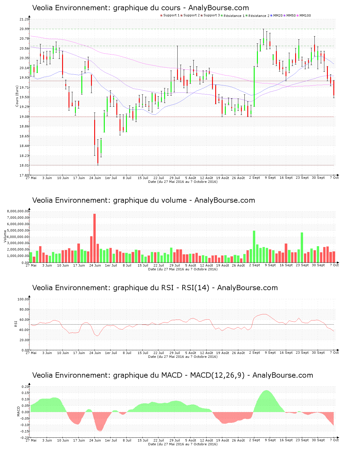 Ces informations constituent une analyse technique de la valeur Veolia Environnement au samedi 8 octobre 2016. Cette analyse peut être invalidée par des éléments plus récents, et ne constitue en aucune manière une incitation d’achat ou de vente sur les marchés financiers. Le lecteur reste libre et responsable de l’interprétation et de l’usage faits de ces informations.