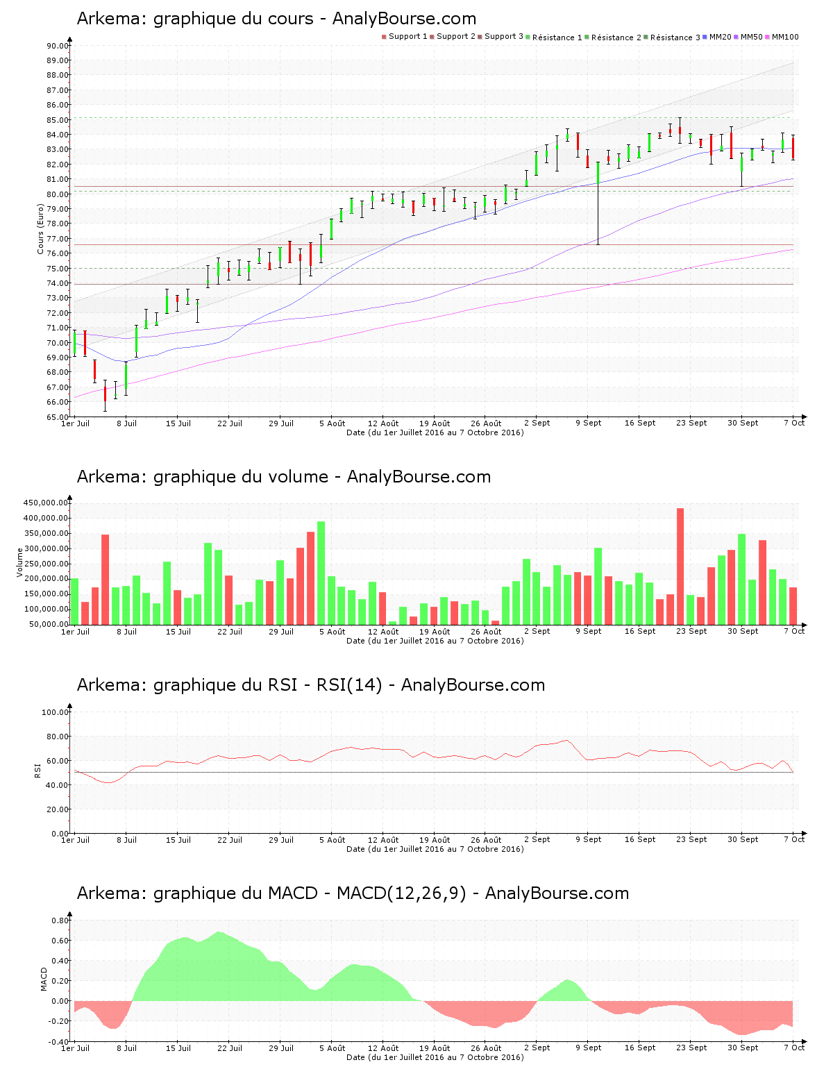 L’action Arkema augmente un peu ces dernières séances. Elle atteint en effet seulement la somme de 82.400 €. Arkema se dévalorisait au contraire la semaine dernière, avec un cours baissier de 1.82%. La valeur a franchi la limite inférieure du canal dans lequel cette dernière fluctuait depuis un certain temps. Elle se trouve à présent fortement en deçà de son canal.