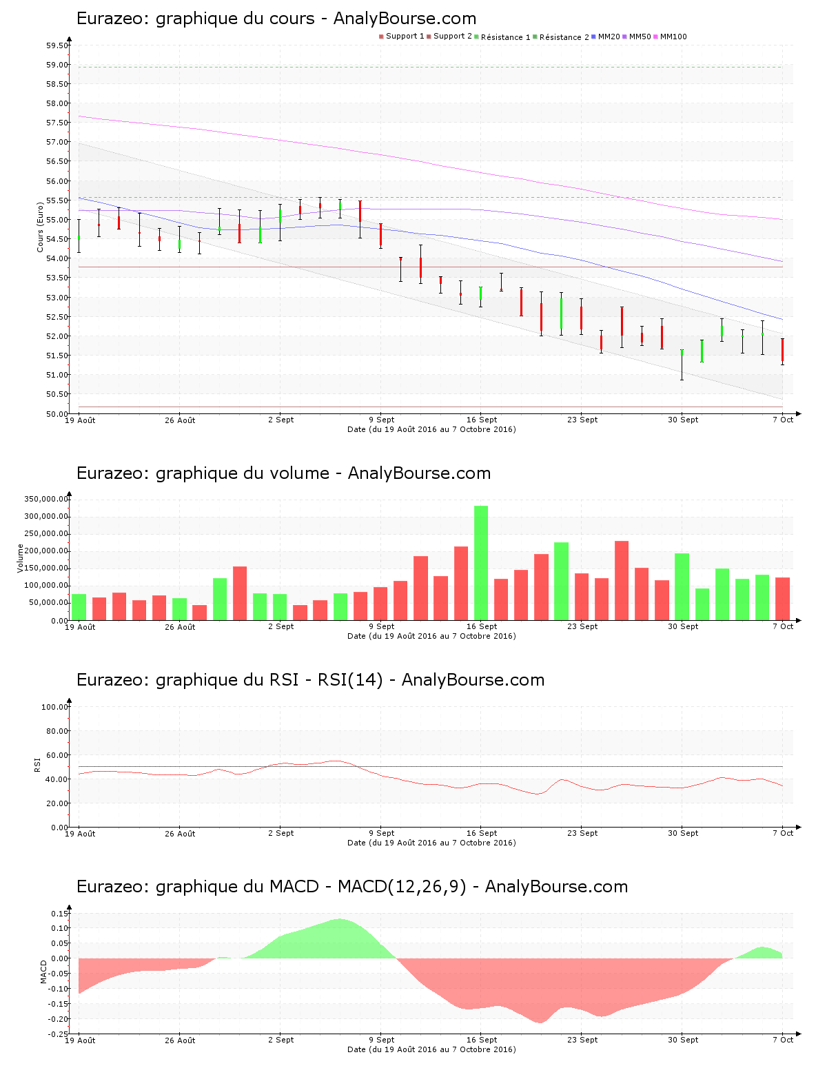 Ces informations constituent une analyse technique de l’action Eurazeo au dimanche 9 octobre 2016. Cette analyse peut être invalidée par des éléments plus récents, et ne constitue en aucune manière une incitation d’achat ou de vente sur les marchés financiers. Le lecteur reste libre et responsable de l’interprétation et de l’usage faits de ces informations.