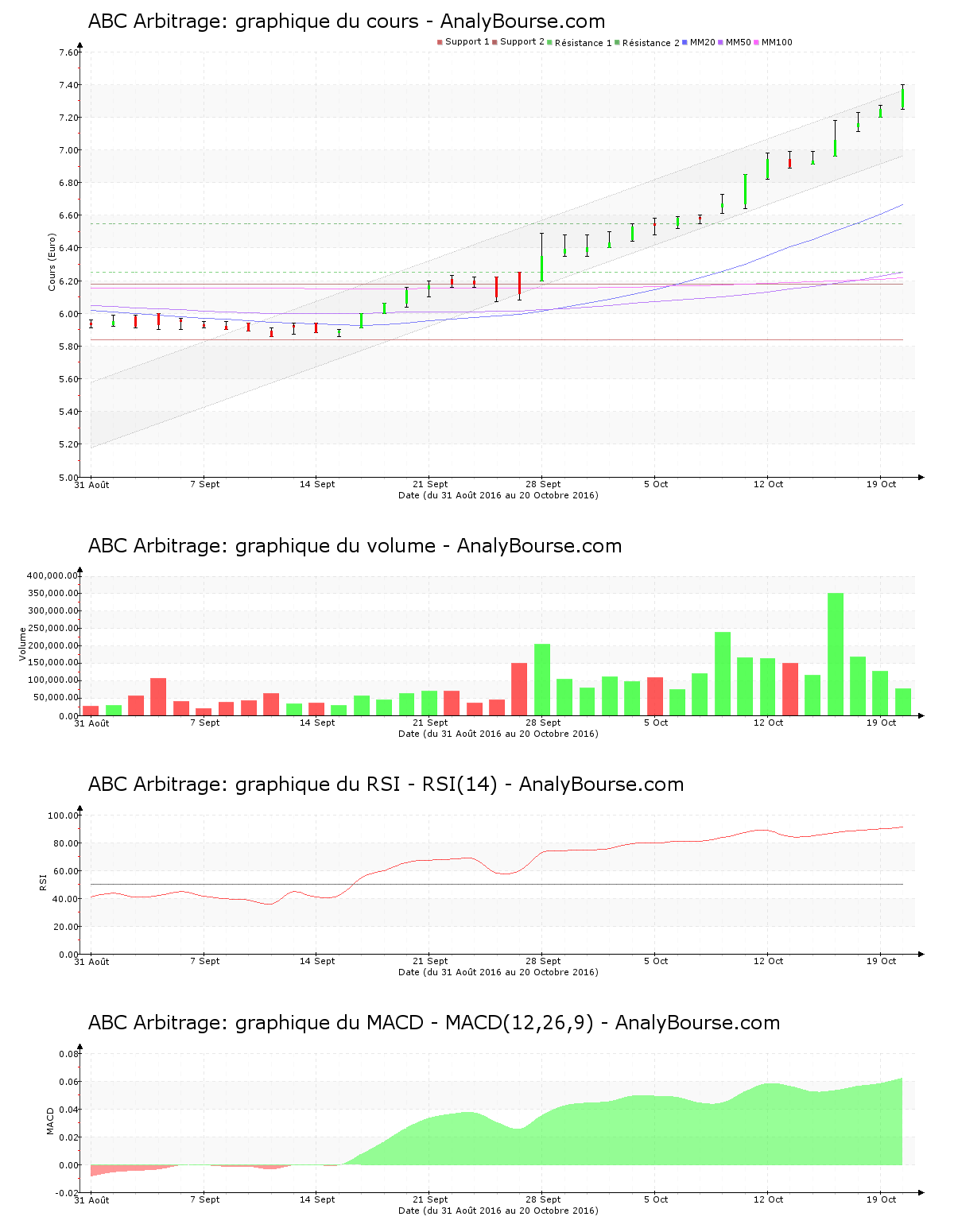 L’évolution haussière de l’action ABC Arbitrage persiste dorénavant depuis cinq séances. Avec un parcours haussier de 6.81%, le titre de ABC Arbitrage est ainsi en vigoureuse croissance depuis vendredi dernier. Dans un volume de sensiblement 76000 titres échangés à 10:23, la valeur ABC Arbitrage augmente toujours ce jeudi 20 octobre, avec un développement haussier de 1.66%. Elle était déjà en progression hier, avec un cours haussier de 1.26%. Partant de 7.250 € pour se rendre à 7.370 €, l’action gonfle finalement de 0.120 €. L’action se trouve juste au-dessus de son canal. Elle ne fluctue de fait plus ce jeudi 20 octobre dans le canal à l’intérieur duquel elle fluctuait depuis quelques temps. Depuis qu’elle s’est retrouvée dans le canal le vendredi 9 septembre 2016, la valeur a conquis 25.13%.