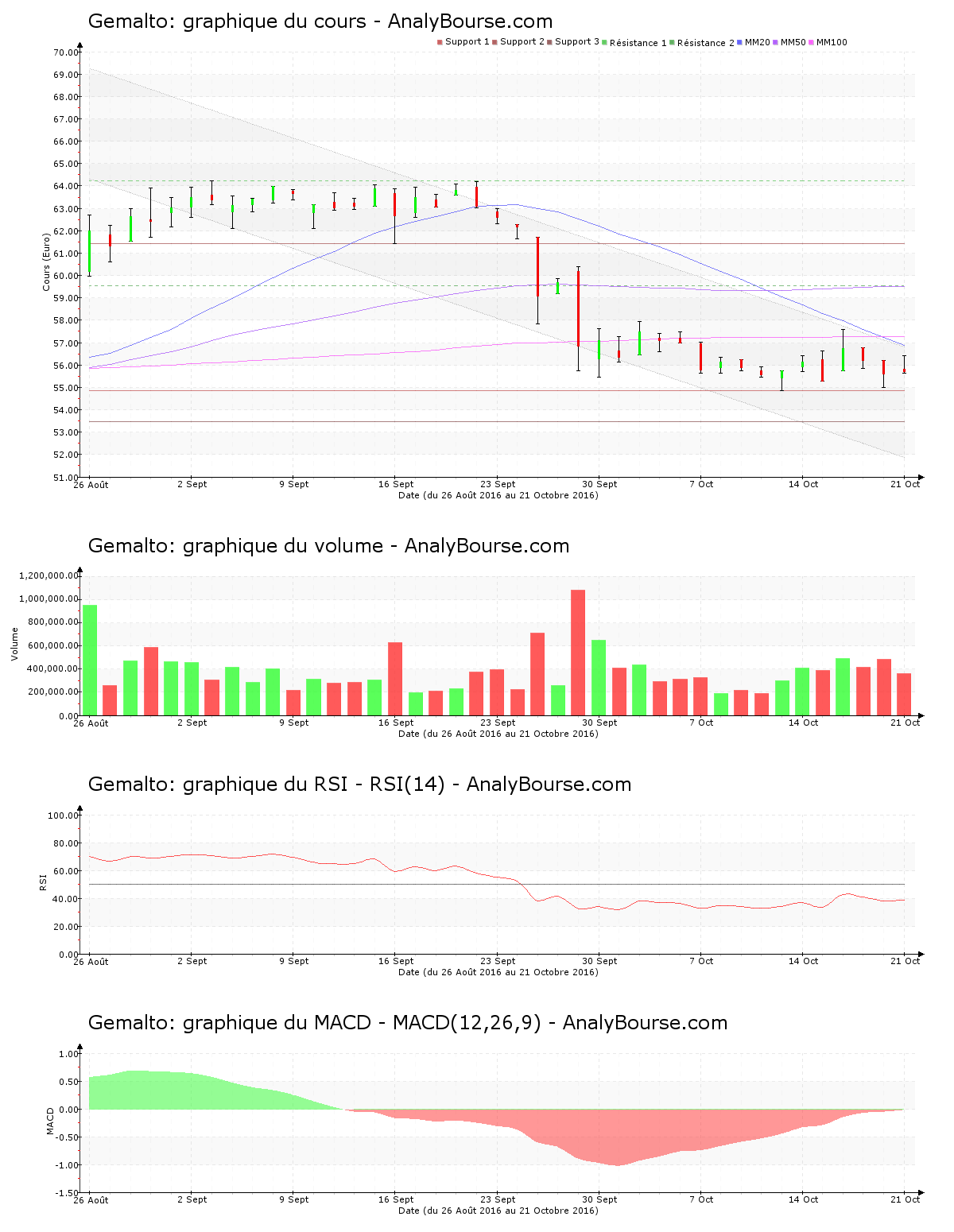 Côté indicateurs, on note que l’indicateur RSI est plutôt stable ces cinq derniers jours. C’est donc toujours dans le niveau de vente qu’il se situe. Cela fait finalement 41 jours de cotations que la moyenne mobile sur cinquante jours de l’action Gemalto se positionne au-delà de sa moyenne mobile sur cent jours. Pour terminer, on constate que ces dernières séances l’indicateur MACD est en solide hausse. C’est maintenant une trajectoire du titre assez stable qu’il suggère à court-moyen terme.