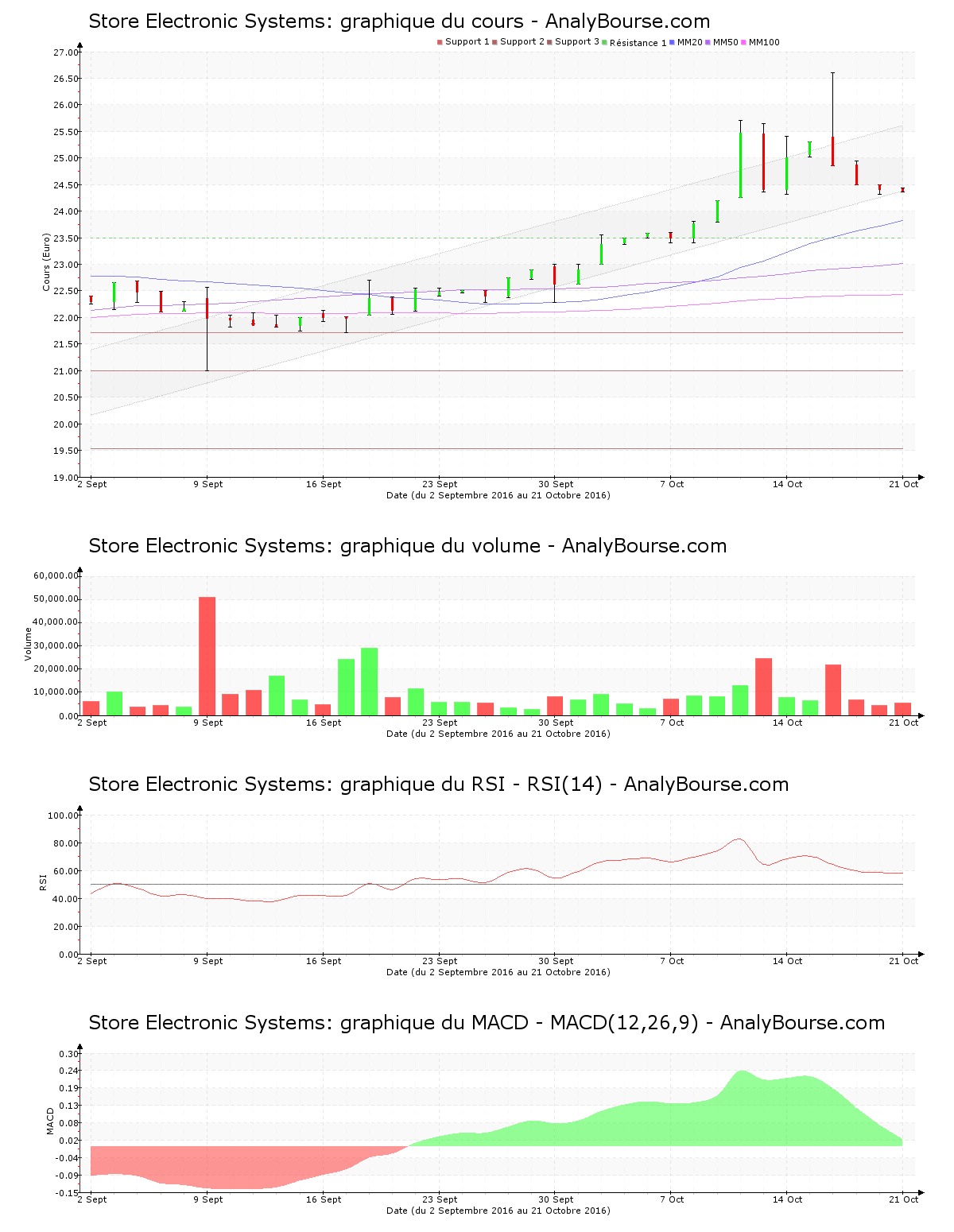 La volonté d’achat sur Store Electronic Systems cette semaine est faible, symbolisée par un développement baissier de 2.52%. La valeur atteint finalement un montant de 24.380 €. Store Electronic Systems bondissait au contraire la semaine dernière, avec un cours en progression de 6.43%. L’orientation s’inverse ainsi avec force ces derniers jours. Store Electronic Systems varie ces cinq dernières séances dans des limites de 9.42%, ce qui dévoile une sensible nervosité sur le titre. La valeur se localise près de la limite inférieure du canal dans lequel cette dernière se développe depuis quelques temps.