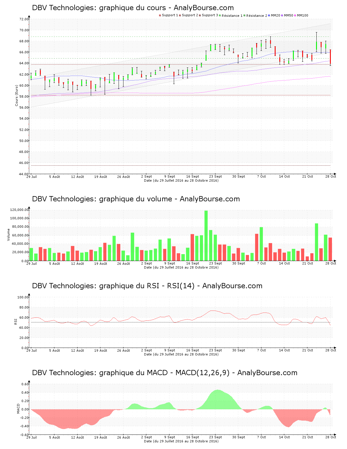 Côté indicateurs, la valeur DBV Technologies possède une moyenne mobile sur vingt jours positionnée au-delà de sa moyenne mobile sur cinquante jours, qui est quant à elle placée au-dessus de sa moyenne mobile sur cent jours. A long terme, la valeur dévoile donc un parcours haussier. Voici maintenant 79 séances que la moyenne mobile sur vingt jours de l’action DBV Technologies se positionne au-delà de sa moyenne mobile sur cinquante jours. De son côté, on remarque que l’indicateur MACD est en substantielle augmentation ces derniers jours. C’est cependant toujours une tendance du titre en substantielle décroissance que ce dernier caractérise sur le court-moyen terme. Pour finir, l’indicateur RSI est assez stable ces derniers jours. Ce dernier se trouve ainsi encore dans le niveau de vente.