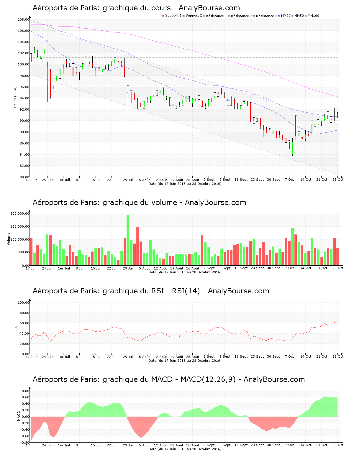 Pour les indicateurs, on relève que ces derniers jours le MACD est en croissance. Il montre finalement une évolution du cours en solide croissance sur le moyen terme. De son côté, l’indicateur RSI est ces cinq dernières séances plutôt stable. C’est ainsi toujours au niveau d’achat que ce dernier se place. Pour finir, la valeur Aéroports de Paris dispose d’une moyenne mobile sur vingt jours localisée en deçà de sa moyenne mobile sur cinquante jours, qui est pour sa part positionnée en-dessous de sa moyenne mobile sur cent jours. Sur la durée, la valeur exprime donc un cours décroissant. Depuis finalement 91 jours de cotations, la moyenne mobile sur cinquante jours de l’action Aéroports de Paris se situe en deçà de sa moyenne mobile sur cent jours.