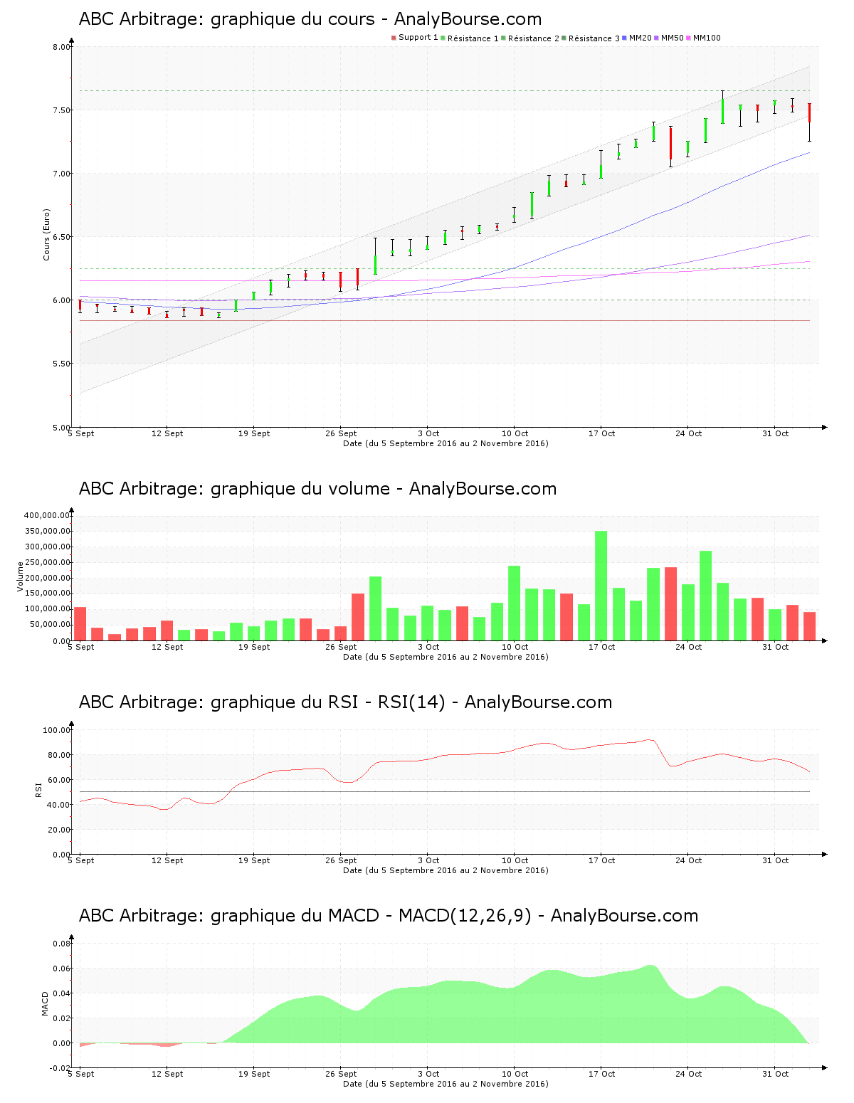Avec un cours en baisse de 2.37%, ABC Arbitrage est en régression en une semaine. Matérialisée par un cours haussier de 13.32%, le titre subit à l’opposé en un mois une ferme pression acheteuse. ABC Arbitrage montre toutefois depuis un an une grande pression acheteuse, reflétée par un mouvement haussier de 46.25%.