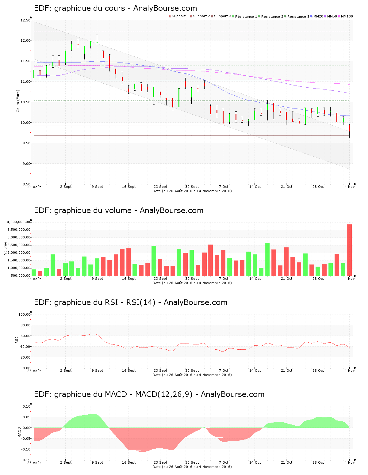 |Il s’agit de la première fois que l’action EDF passe ce niveau depuis le mardi 28 juin 2016. Avec un comportement baissier de 5.69%, EDF est en vigoureuse baisse ces derniers jours. L’action atteint dorénavant 9.780 €. Avec un cours en hausse de 3.08%, le résultat était à l’opposé encourageant la semaine dernière pour EDF. La tendance s’inverse ainsi vigoureusement ces cinq derniers jours. Remarquons, avec un pourcentage de 7.79% distançant cette semaine les extrêmes, une manifeste effervescence sur EDF. Le cours a franchi le support des 9.920 € cette semaine. Le prochain support se positionne à 9.680 €. L’action se place dans la limite supérieure du canal à l’intérieur duquel cette dernière se limite depuis quelques semaines.