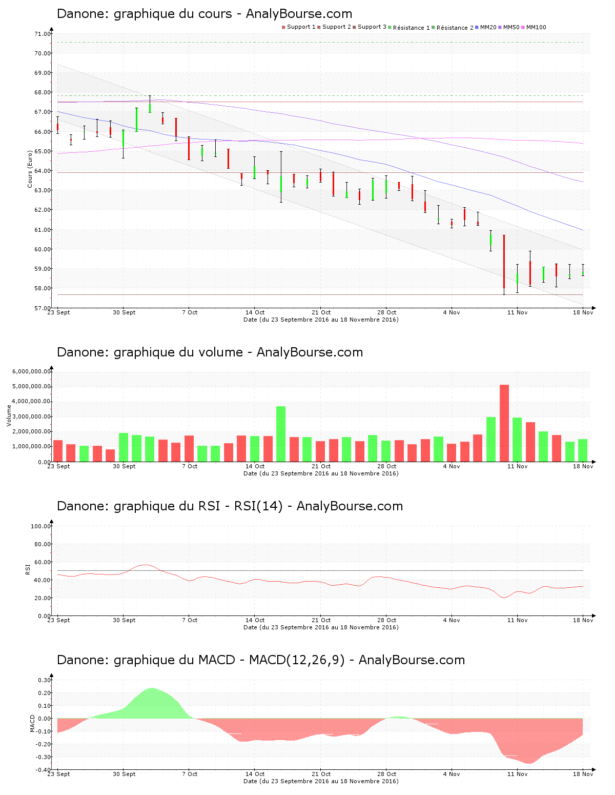 Côté indicateurs, la moyenne mobile sur 20 jours de l’action Danone est positionnée en deçà de sa moyenne mobile sur 50 jours, qui est quant à elle localisée en deçà de sa moyenne mobile sur 100 jours. L’action traduit par conséquent un parcours baissier à longue échéance. Depuis désormais 44 séances, la moyenne mobile sur 20 jours de la valeur Danone se trouve en deçà de sa moyenne mobile sur 50 jours. On constate que cette semaine le RSI est assez stable. Il se positionne donc encore dans le niveau de vente. Enfin, on observe que l’indicateur MACD est en importante progression ces dernières séances. Il caractérise toutefois encore une trajectoire du cours en importante régression sur le moyen-court terme.