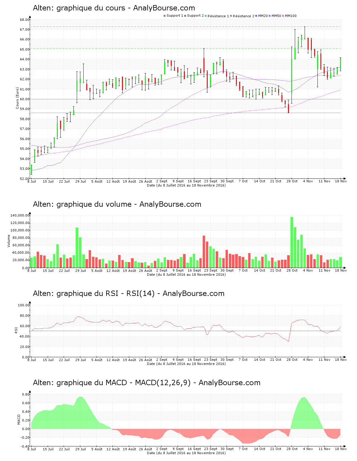 |Alten supporte ces derniers jours une pression acheteuse, affectée par un développement haussier de 2.46%. La valeur atteint finalement la valorisation de 64.110 €. Alten était à l’inverse en baisse la semaine dernière, avec un parcours baissier de 3.68%. La tendance s’inverse donc faiblement cette semaine. Le comportement du titre l’emmène à présent proche de la résistance des 65.090 €.