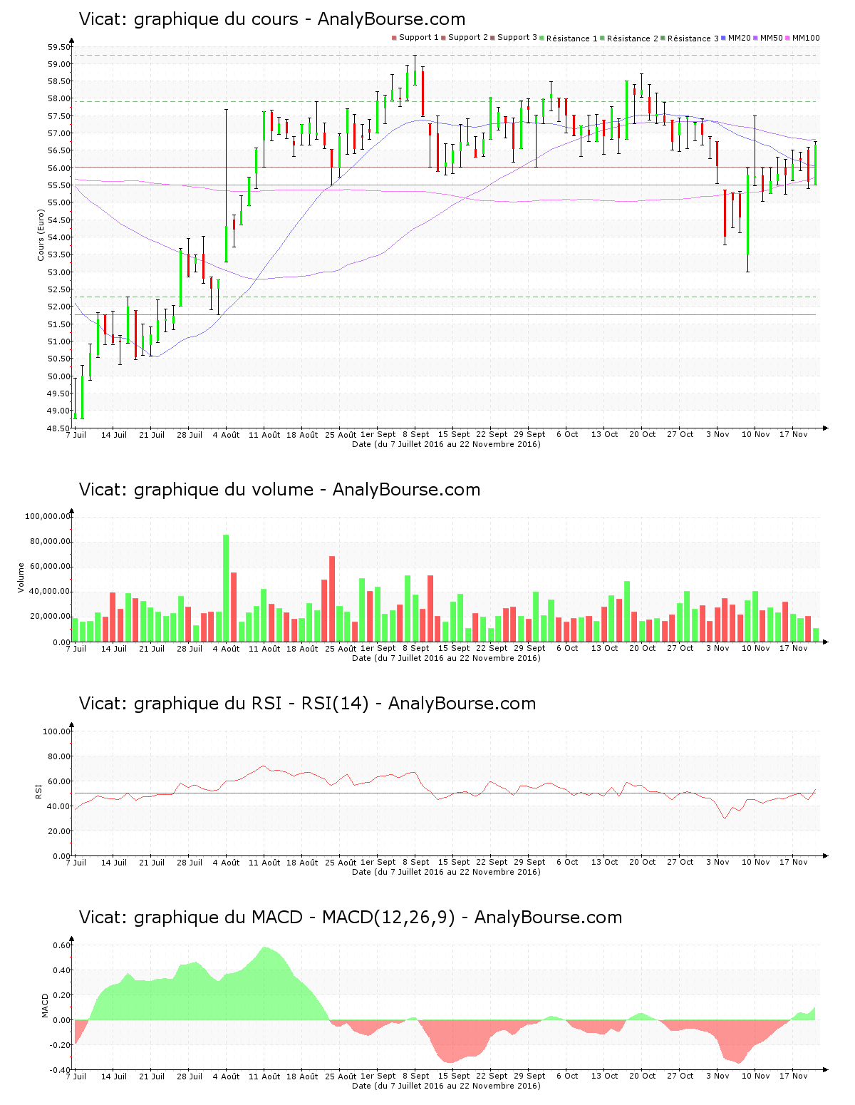Concernant les indicateurs, on constate que ce jour l’indicateur MACD est en solide hausse. Il indique finalement une évolution du cours en conséquente croissance sur le moyen-court terme. On observe que l’indicateur RSI est en progression ce jour. Il est passé au niveau d’achat, cela pourrait caractériser un commencement de tendance en progression pour l’action Vicat à longue échéance.