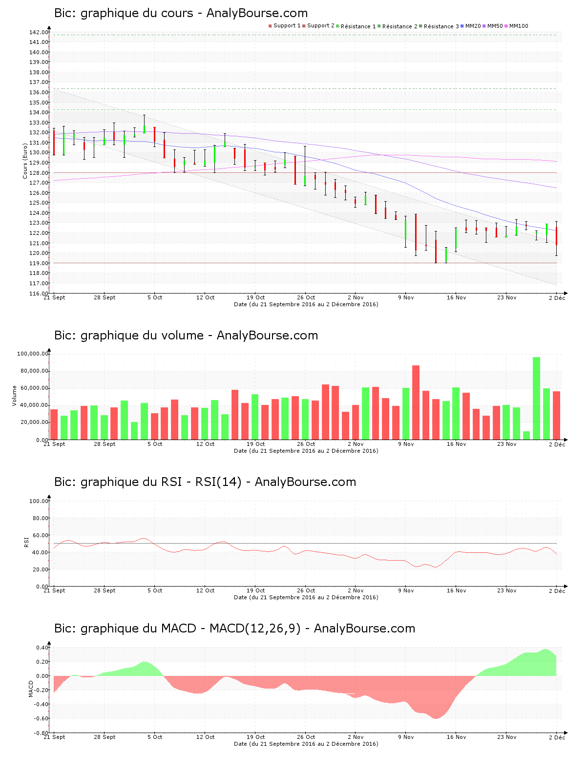 Côté indicateurs, concernant l’indicateur MACD, on repère que ce dernier est en importante hausse ces cinq derniers jours de cotations. C’est dorénavant une tendance du cours en forte croissance que ce dernier indique sur le moyen terme. De son côté, pour l’indicateur RSI, on observe que ce dernier est assez stable ces cinq derniers jours de cotations. Ce dernier se place donc encore dans le niveau de vente. Enfin, la moyenne mobile sur 20 jours de la valeur Bic est placée en deçà de sa moyenne mobile sur 50 jours, qui est elle-même située en deçà de sa moyenne mobile sur 100 jours. A longue échéance, la valeur exprime ainsi un développement en baisse. La moyenne mobile sur 20 jours de la valeur Bic se positionne à présent en deçà de sa moyenne mobile sur 50 jours depuis 52 séances de cotations.