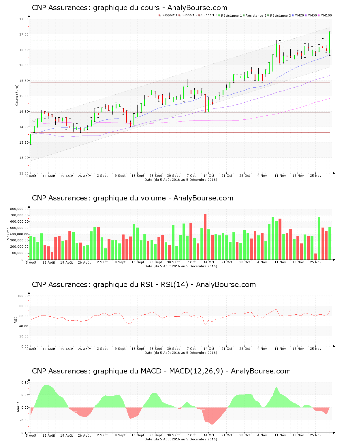 Avec un volume à 17:29 de sensiblement 521000 actions échangées, le bilan est franchement bon aujourd’hui pour CNP Assurances, avec un comportement haussier de 3.71%. L’action atteint dorénavant la cotation de 17.060 €. L’intention d’achat sur CNP Assurances vendredi dernier était au contraire faible, imprégnée par un cours baissier de 0.60%. La pondération acheteurs/vendeurs s’inverse donc vigoureusement ce jour. Le titre a passé la résistance des 16.800 € ce lundi. CNP Assurances évolue ce jour dans des limites de 4.78%, ce qui dévoile des échanges assez agités sur le titre.
