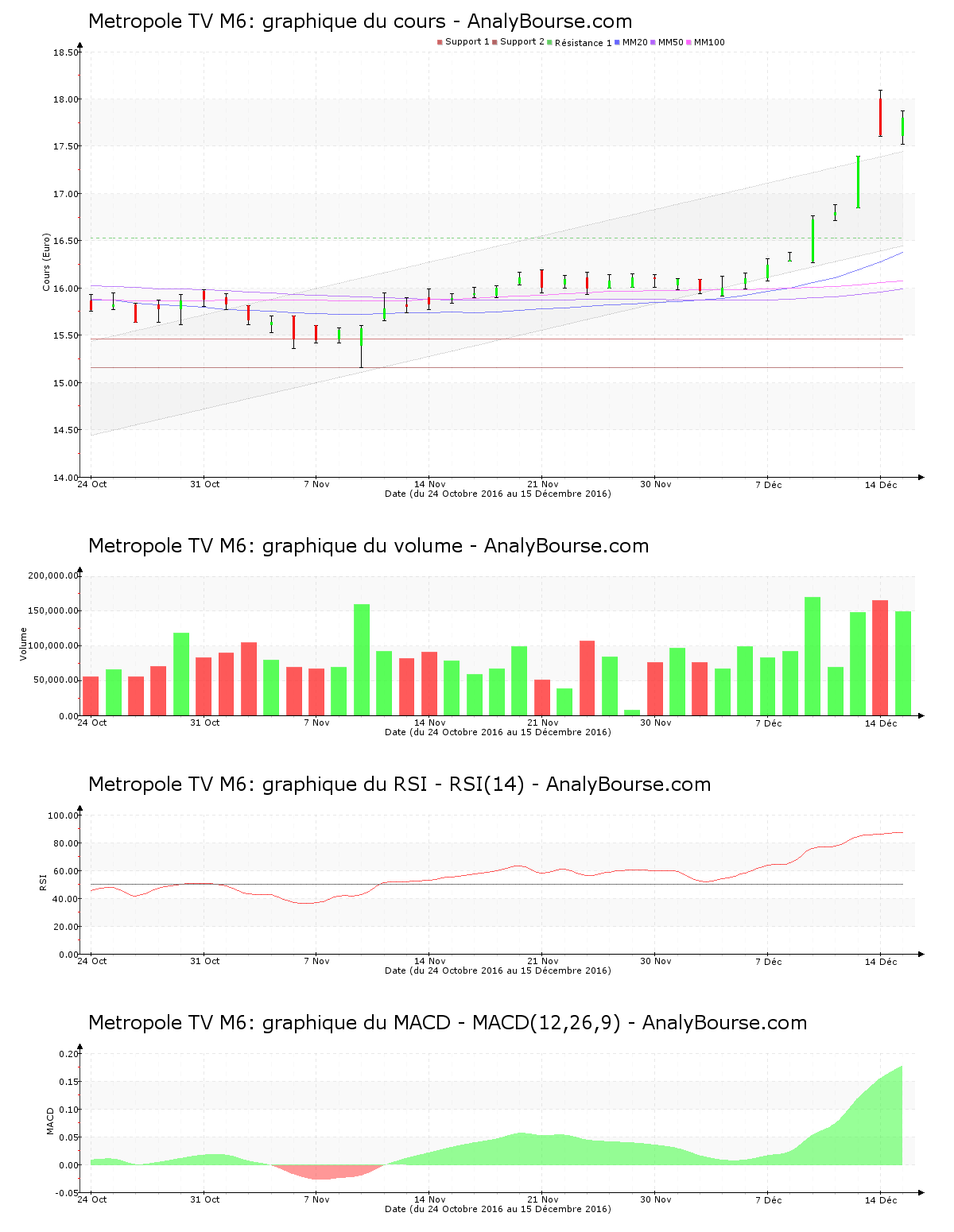 Le mouvement croissant de la valeur Metropole TV M6 se poursuit désormais depuis neuf jours de cotations. Concrétisée par un parcours haussier de 11.46%, la demande sur le cours de Metropole TV M6 depuis le lundi 5 décembre 2016 est donc particulièrement vigoureuse. Avec un volume à la clôture de 149000 actions échangées, avec un parcours haussier de 1.02%, l’action Metropole TV M6 s’apprécie encore aujourd’hui. Caractérisée par un comportement haussier de 1.32%, la volonté d’achat sur elle hier était déjà bien présente. L’action augmente désormais de 0.180 €, démarrant à 17.620 € pour atteindre 17.800 €.