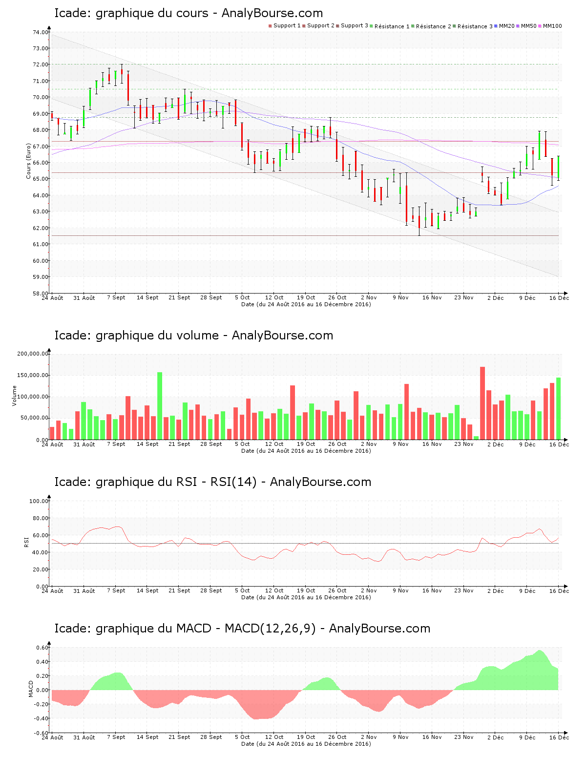 La moyenne mobile sur 20 jours de l’action Icade est placée en-dessous de sa moyenne mobile sur 50 jours, qui est pour sa part placée en deçà de sa moyenne mobile sur 100 jours. La valeur révèle ainsi un cours décroissant sur la durée. Depuis désormais 50 jours de cotations, la moyenne mobile sur 20 jours de l’action Icade se trouve en deçà de sa moyenne mobile sur 50 jours. Pour sa part, on remarque que le MACD est en conséquente diminution cette semaine. Ce dernier dévoile malgré tout toujours une évolution du titre en forte progression à moyen-court terme. Pour terminer, on repère que ces cinq dernières séances le RSI est assez stable. C’est donc toujours au niveau d’achat qu’il se positionne.