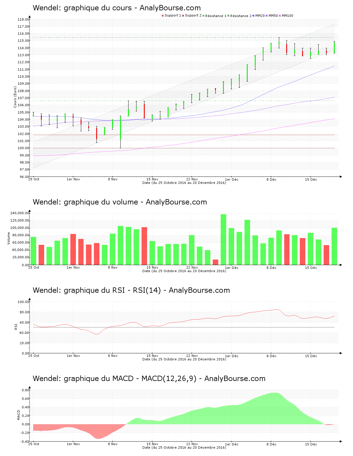 Du côté des indicateurs, on relève qu’aujourd’hui l’indicateur MACD est plutôt stable. Aujourd’hui, le MACD est passé en secteur positif, ceci pourrait suggérer un prémice d’une évolution haussière pour la valeur Wendel à longue échéance.