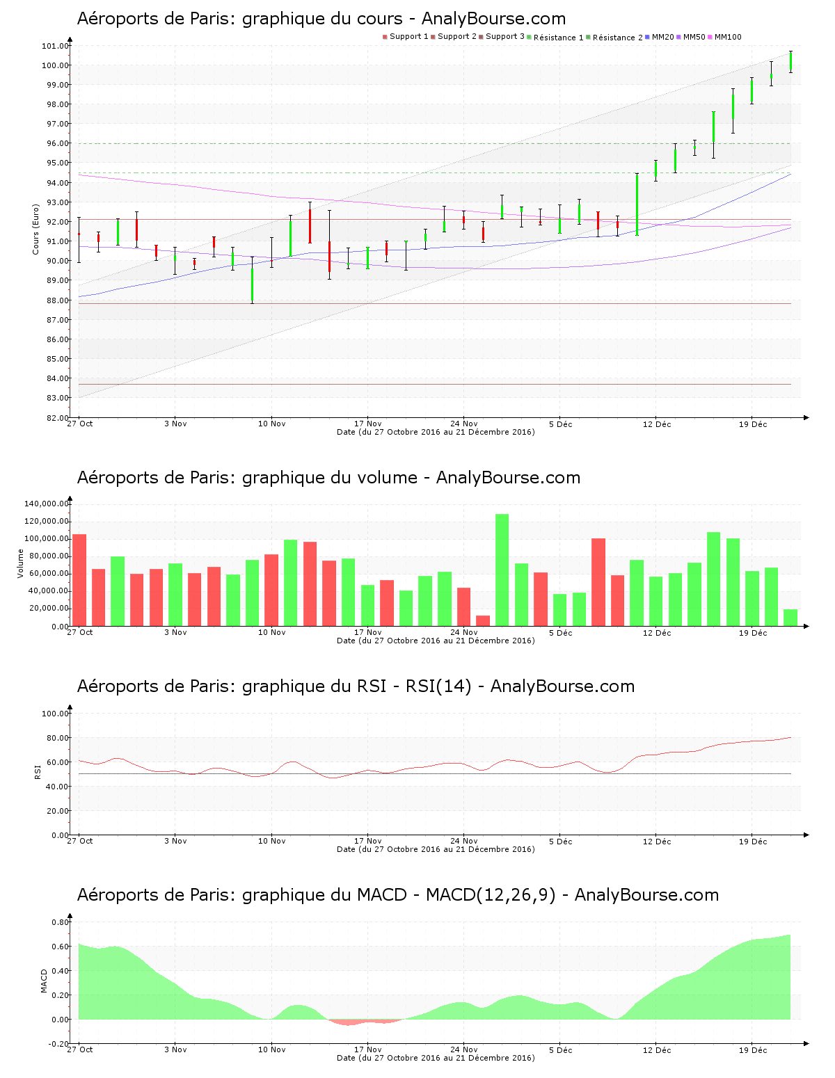 Avec 19000 titres échangés à 12:00, illustrée par un développement haussier de 1.08%, la sollicitation sur l’action Aéroports de Paris ce mercredi est bien présente. Commençant à 99.530 € pour aboutir à 100.600 €, l’action gonfle désormais de 1.070 €. Quantifiée par un cours haussier de 0.36%, la volonté d’achat sur Aéroports de Paris hier était neutre. Le mouvement haussier reprend par conséquent ce mercredi. Cela fait à présent dix séances que la valeur Aéroports de Paris est en croissance. Avec un comportement en ferme croissance de 9.83%, le titre de Aéroports de Paris est par conséquent depuis le jeudi 8 décembre 2016 très entouré. La valeur se trouve au-dessus de son canal. Elle ne se cantonne en effet plus ce mercredi 21 décembre dans le canal à l’intérieur duquel elle évoluait depuis quelques temps. La valeur a gagné 11.28%, depuis le mardi 8 novembre 2016, jour de son entrée dans le canal.