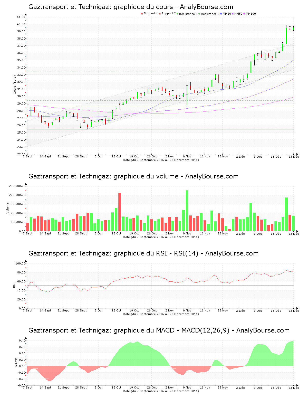 L’action Gaztransport et Technigaz possède une moyenne mobile sur vingt jours localisée au-dessus de sa moyenne mobile sur cinquante jours, qui est pour sa part positionnée au-delà de sa moyenne mobile sur cent jours. Sur la durée, l’action révèle donc un comportement haussier. La moyenne mobile sur vingt jours de l’action Gaztransport et Technigaz se trouve à présent au-delà de sa moyenne mobile sur cinquante jours depuis 45 jours. Ensuite, l’indicateur MACD est cette semaine en importante progression. Il esquisse maintenant une trajectoire du cours en vigoureuse augmentation à court-moyen terme. Concernant le RSI, on remarque qu’il est relativement stable ces dernières séances. C’est ainsi encore dans le niveau de surachat qu’il se localise.