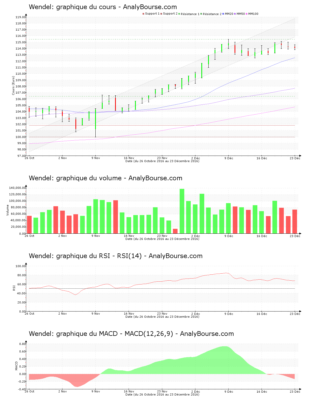Ces informations constituent une analyse technique de la valeur Wendel au dimanche 25 décembre 2016. Cette analyse peut être invalidée par des éléments plus récents, et ne constitue en aucune manière une incitation d’achat ou de vente sur les marchés financiers. Le lecteur reste libre et responsable de l’interprétation et de l’usage faits de ces informations.