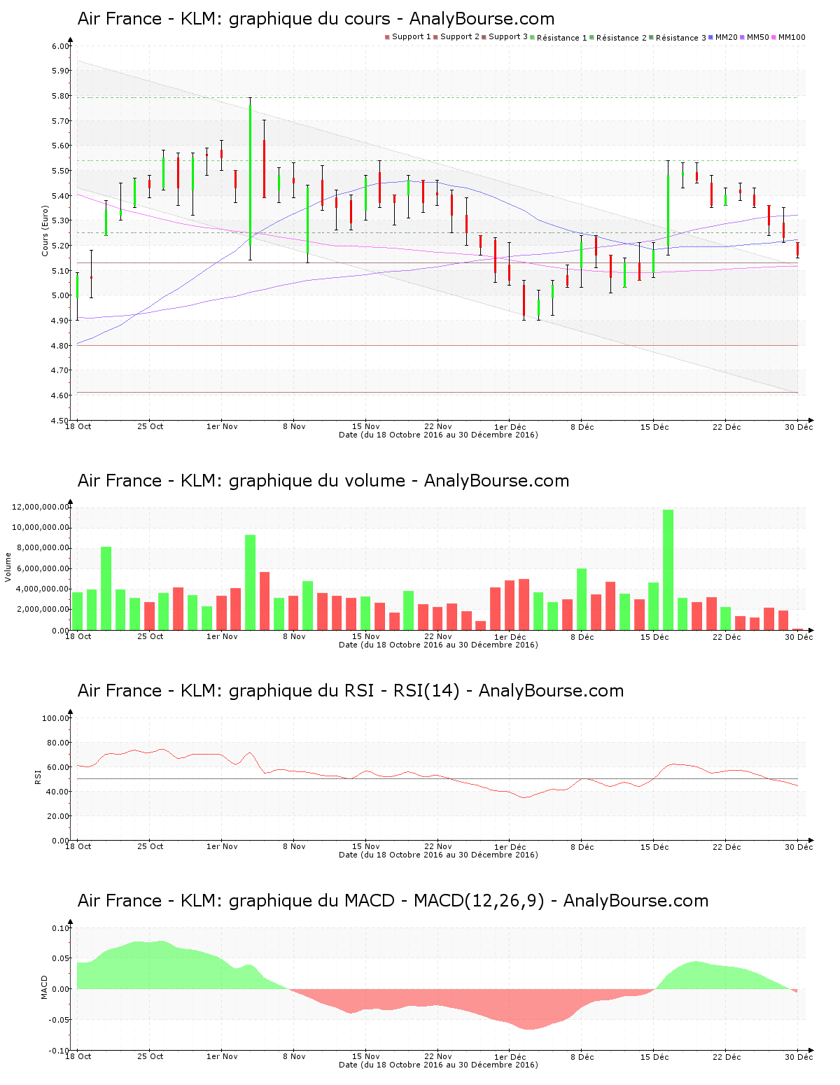 Dans un volume de 119000 actions échangées à 09:28, le bilan est encore décourageant ce jour pour la valeur Air France – KLM, avec un développement baissier de 1.34%. La sollicitation sur cette dernière hier était déjà faible, caractérisée par un cours décroissant de 0.95%. Naviguant de 5.230 € à 5.160 €, l’action décroît maintenant de 0.070 €. La valeur Air France – KLM est à présent en baisse depuis 4 jours. Le parcours est ainsi franchement défavorable depuis mardi dernier pour le cours de Air France – KLM, avec un développement baissier de 4.62%. Le développement du cours l’entraîne finalement près du support des 5.130 €.