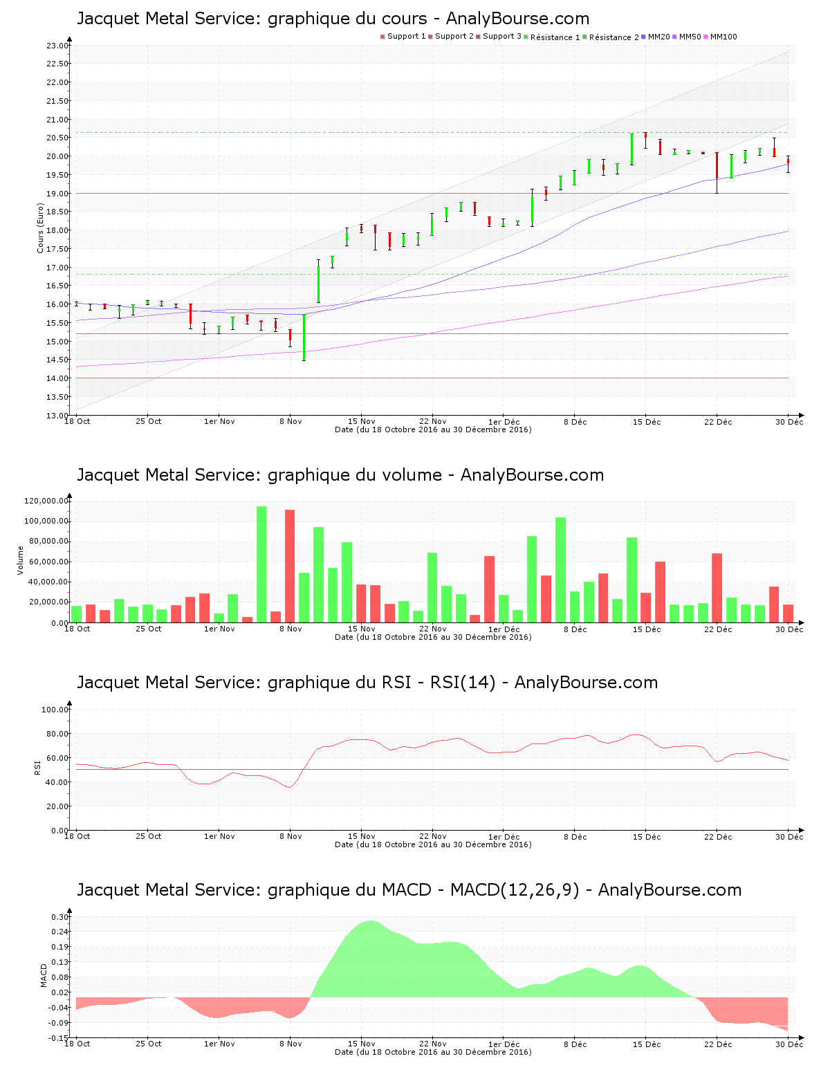 On repère que cette semaine le MACD est en diminution. Ce dernier dévoile à présent une tendance du cours en ferme décroissance à court-moyen terme. La moyenne mobile sur vingt jours de l’action Jacquet Metal Service se situe au-delà de la moyenne mobile sur cinquante jours, et la moyenne mobile sur cinquante jours se positionne elle-même au-delà de la moyenne mobile sur cent jours. L’action traduit par conséquent un parcours haussier sur la durée. Enfin, le RSI est ces cinq derniers jours stable. C’est ainsi encore dans le niveau d’achat qu’il se positionne.