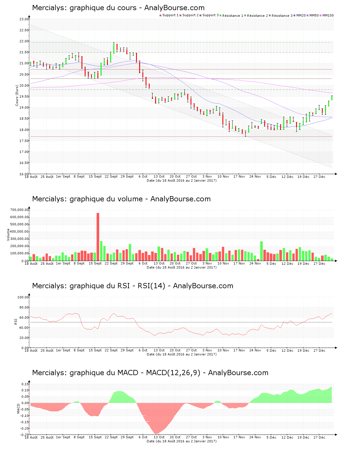 Avec un volume à 13:22 d’à peu près 30000 titres échangés, avec un développement en progression de 1.30%, l’action Mercialys est toujours aujourd’hui entourée. Avec un développement en progression de 1.00%, elle était déjà vendredi dernier recherchée. Passant de 19.250 € à 19.500 €, la valeur se revalorise à présent de 0.250 €. La valeur Mercialys se revend à son montant d’il y a pas moins de 45 séances de cotations. Le cours navigue maintenant à proximité de la résistance des 19.800 €.