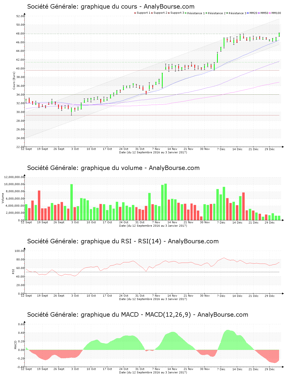 Avec environ 1.2 million de titres échangés à 11:27, la sollicitation sur l’action Société Générale ce jour est bien présente, imprégnée par un comportement haussier de 2.43%. L’action s’enchérit désormais de 1.140 €, commençant à 46.910 € pour accéder à 48.050 €. La volonté d’achat sur Société Générale hier était neutre, matérialisée par un comportement haussier de 0.34%. Le mouvement croissant reprend ainsi ce mardi. Le cours a dépassé la résistance des 47.900 € ce mardi.