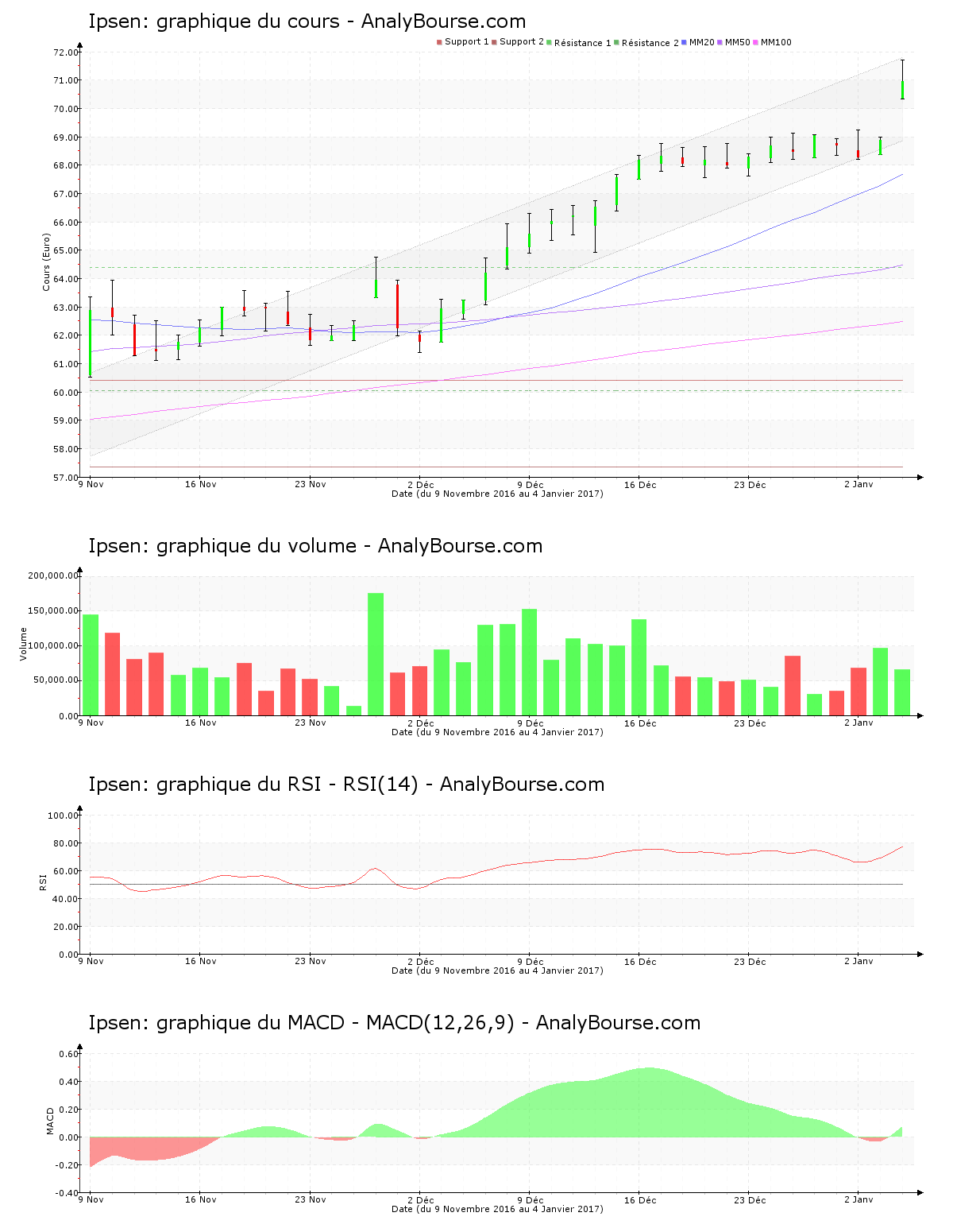 Du côté des indicateurs, le RSI est ce jour stable. C’est donc toujours au niveau de surachat qu’il se trouve. On remarque que ce mercredi le MACD est en conséquente hausse. Aujourd’hui, le MACD est passé en territoire positif, ce qui peut ébaucher un commencement d’une trajectoire croissante pour la valeur Ipsen sur la durée.