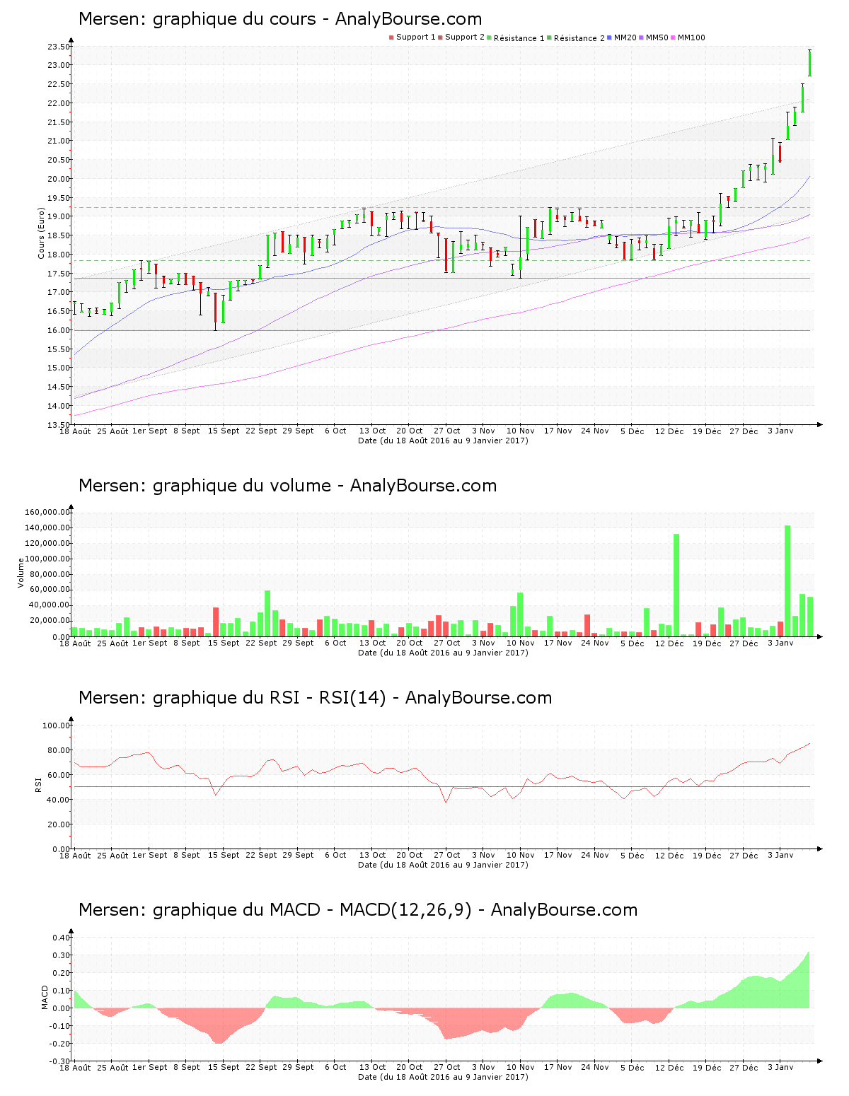 Mersen est en conséquente augmentation depuis une semaine, avec un cours croissant de 13.25%. Le cours est de même manière en substantielle hausse sur un mois, avec un cours en croissance de 30.54%. Mersen explose sur un an, avec un cours croissant de 55.08%.