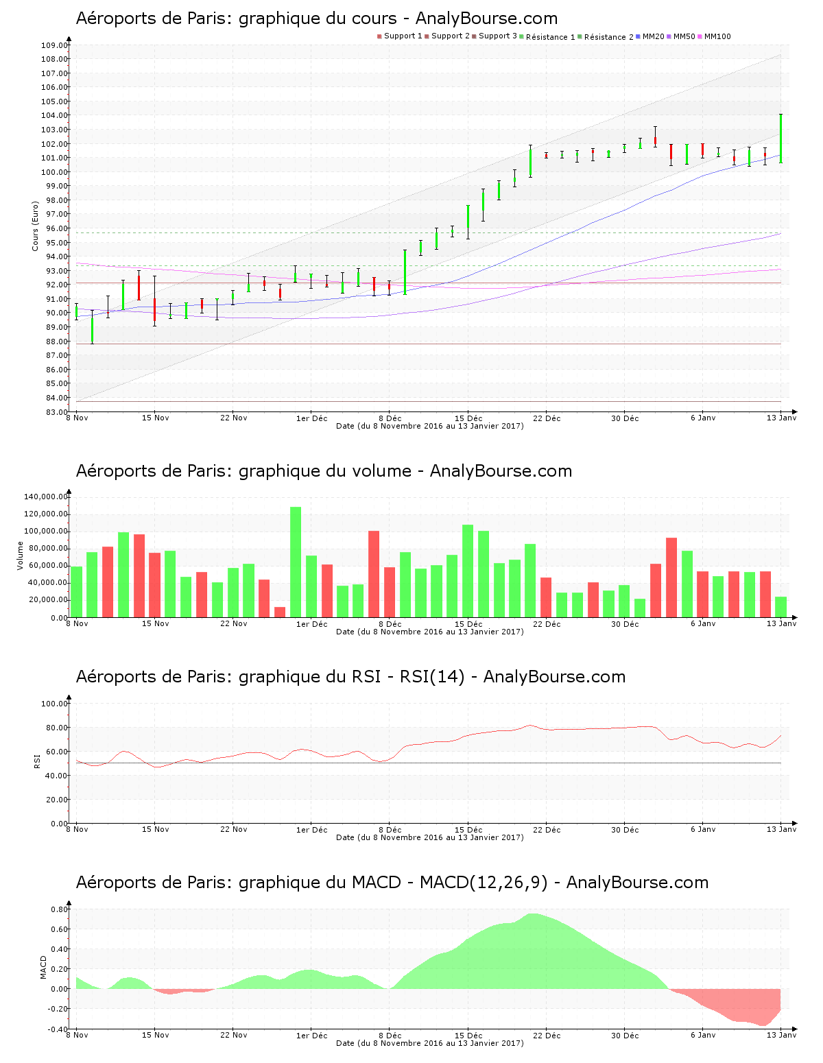 Avec environ 24000 titres échangés à 12:03, avec un développement en vigoureuse progression de 2.87%, l’action Aéroports de Paris est ce jour remarquablement sollicitée. Naviguant de 101.100 € à 104.000 €, l’action bondit désormais de 2.900 €. Aéroports de Paris montrait hier un équilibre des forces, marquée par un cours décroissant de 0.39%. La valeur reprend par conséquent son comportement croissant. On constate des échanges assez instables ce vendredi 13 janvier sur le cours, avec un pourcentage de 3.43% qui écarte les extrêmes de Aéroports de Paris.
