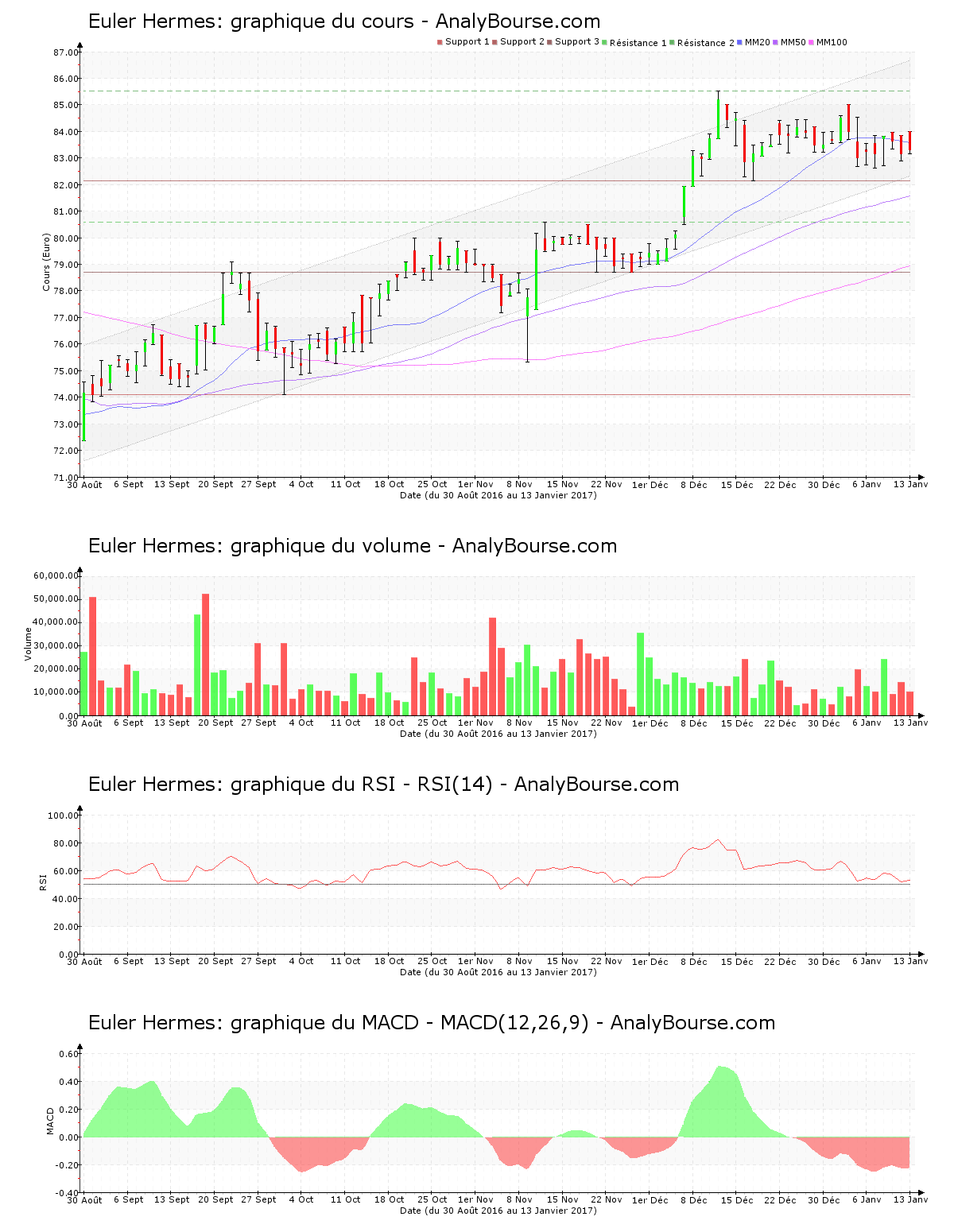 On constate que le RSI est assez stable ces cinq dernières séances. Ce dernier se trouve ainsi encore dans le niveau neutre. Ensuite, la moyenne mobile sur 20 jours de la valeur Euler Hermes se place au-delà de la moyenne mobile sur 50 jours, et la moyenne mobile sur 50 jours se positionne elle-même au-delà de la moyenne mobile sur 100 jours. A long terme, l’action traduit ainsi un développement haussier. La moyenne mobile sur 20 jours de l’action Euler Hermes se trouve dorénavant au-delà de sa moyenne mobile sur 50 jours depuis 84 séances de cotations. Pour finir, le MACD est ces cinq derniers jours de cotations plutôt stable. C’est donc toujours une évolution du titre en importante diminution qu’il signale sur le court-moyen terme.