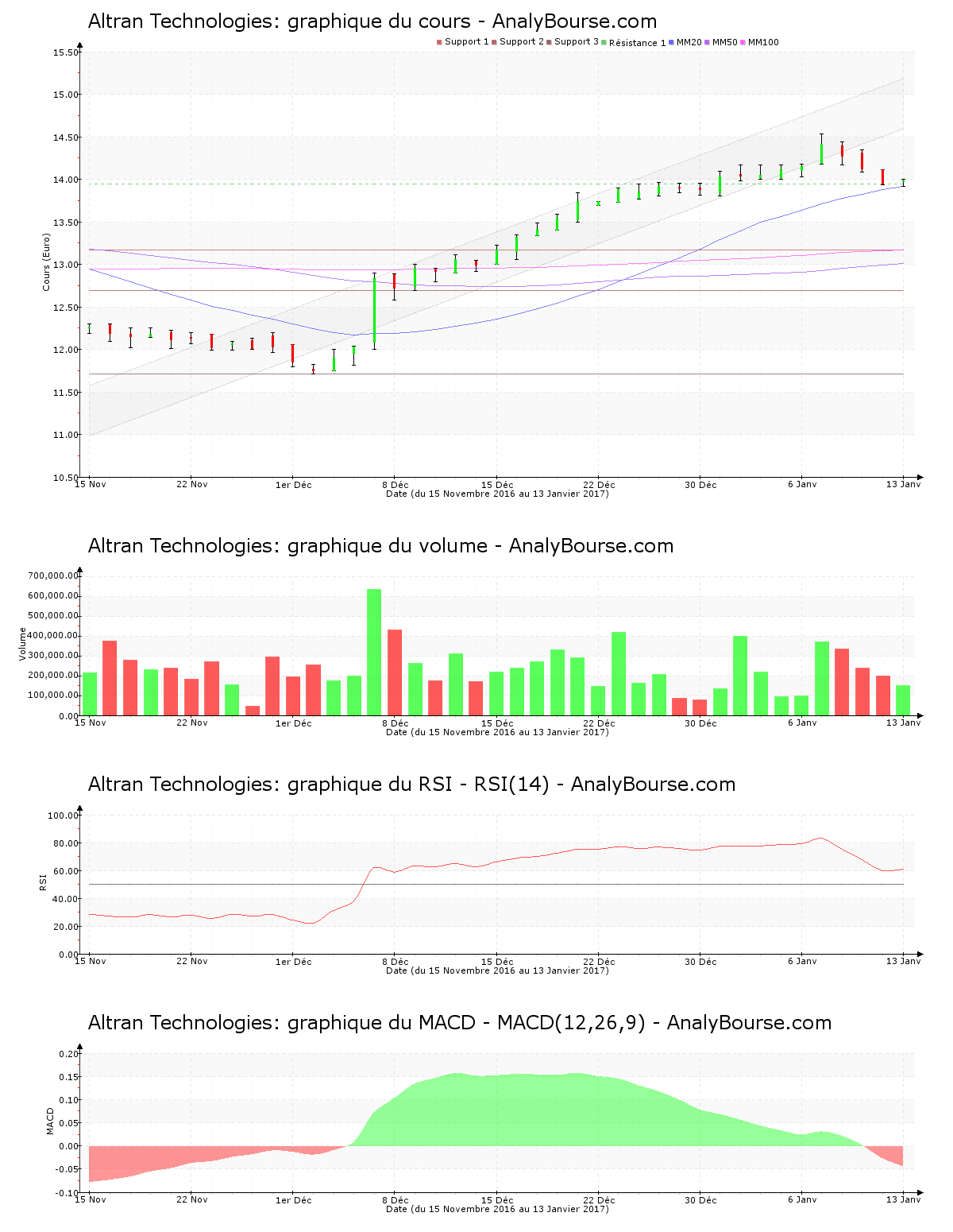 Avec un cours décroissant de 1.20%, le résultat est décourageant ces derniers jours pour Altran Technologies. L’action se valorise maintenant à 13.980 €. Avec un cours en hausse de 1.95%, Altran Technologies augmentait au contraire la semaine dernière. La valeur Altran Technologies rebaisse donc un peu cette semaine. L’action ne se cantonne plus dans le canal dans lequel cette dernière s’enclavait depuis quelques semaines. A présent, cette dernière navigue fortement en-dessous de son canal.