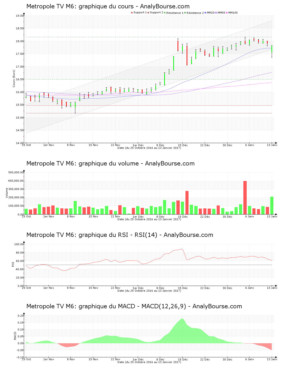 Côté indicateurs, la moyenne mobile sur 20 jours de la valeur Metropole TV M6 se localise au-delà de la moyenne mobile sur 50 jours, et la moyenne mobile sur 50 jours se situe pour sa part au-delà de la moyenne mobile sur 100 jours. A longue échéance, l’action dévoile par conséquent un développement en hausse. Pour sa part, on repère que l’indicateur MACD est en baisse ces dernières séances. Ce dernier montre finalement une évolution du cours en diminution sur le court-moyen terme. Pour terminer, on remarque que ces cinq dernières séances de cotations l’indicateur RSI est relativement stable. Ce dernier se localise donc encore au niveau d’achat.