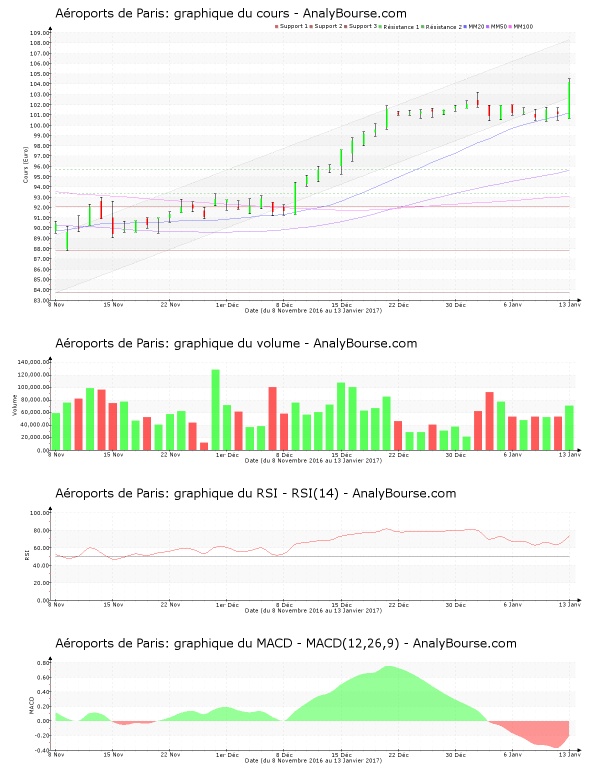 Concernant les indicateurs, concernant le MACD, on relève que ce dernier est en régression ces cinq dernières séances de cotations. Il indique dorénavant une évolution du titre en importante régression à moyen-court terme. La moyenne mobile sur vingt jours de l’action Aéroports de Paris se situe au-dessus de la moyenne mobile sur cinquante jours, qui se localise pour sa part au-delà de la moyenne mobile sur cent jours. A longue échéance, la valeur traduit par conséquent un parcours en augmentation. La moyenne mobile sur vingt jours de la valeur Aéroports de Paris se positionne dorénavant au-dessus de sa moyenne mobile sur cinquante jours depuis 43 jours de cotations. Pour finir, l’indicateur RSI est relativement stable ces dernières séances. C’est par conséquent encore dans le niveau d’achat que ce dernier se localise.