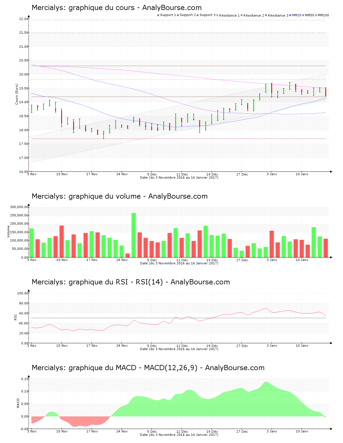Pour les indicateurs, l’indicateur MACD est ce lundi 16 janvier en baisse. L’indicateur MACD a basculé en terrain négatif ce lundi, cela peut révèler une ébauche d’une trajectoire baissière sur la durée pour la valeur Mercialys.