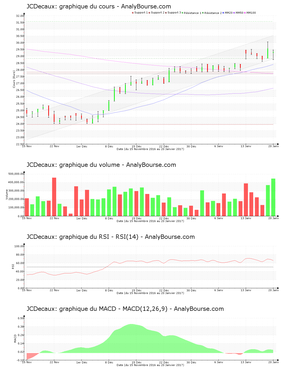 |Il s’agit de la première fois que la valeur JCDecaux passe ce seuil depuis plus de 81 jours. Concrétisée par un cours haussier de 0.38%, la demande sur l’action JCDecaux ces dernières séances est neutre. Cette dernière gonfle légèrement en effet seulement de 0.110 €, allant de 29.200 € à 29.310 € ces cinq dernières séances de cotations. La sollicitation sur JCDecaux la semaine dernière était au contraire très substantielle, concrétisée par un cours en augmentation de 4.21%. C’est dans la zone inférieure de son canal que l’action évolue.