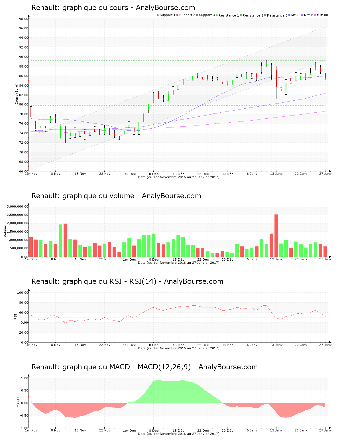 Ces informations constituent une analyse technique de la valeur Renault au samedi 28 janvier 2017. Cette analyse peut être invalidée par des éléments plus récents, et ne constitue en aucune manière une incitation d’achat ou de vente sur les marchés financiers. Le lecteur reste libre et responsable de l’interprétation et de l’usage faits de ces informations.