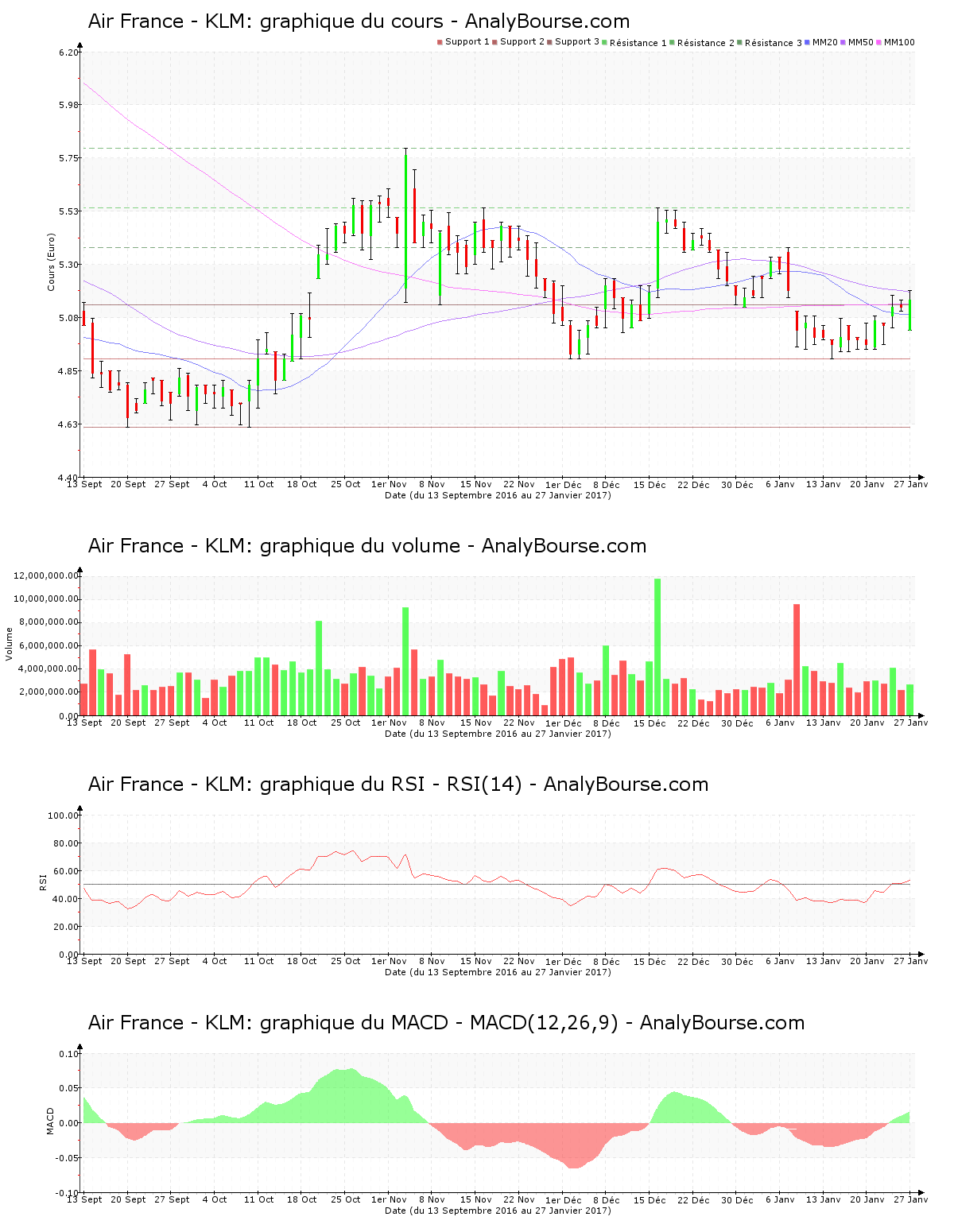 En ce qui concerne les indicateurs, voilà dorénavant 32 séances que la moyenne mobile sur vingt jours de l’action Air France – KLM se positionne en deçà de sa moyenne mobile sur cinquante jours. Pour sa part, on repère que ces cinq derniers jours l’indicateur MACD est en augmentation. C’est à présent une évolution du titre stable qu’il dessine à moyen terme. L’indicateur MACD est passé en secteur positif mercredi dernier, ce qui peut dessiner un engagement d’une orientation croissante sur le long terme pour Air France – KLM. Pour finir, pour le RSI, on repère que ce dernier est en croissance cette semaine. C’est maintenant au niveau neutre que ce dernier se localise.