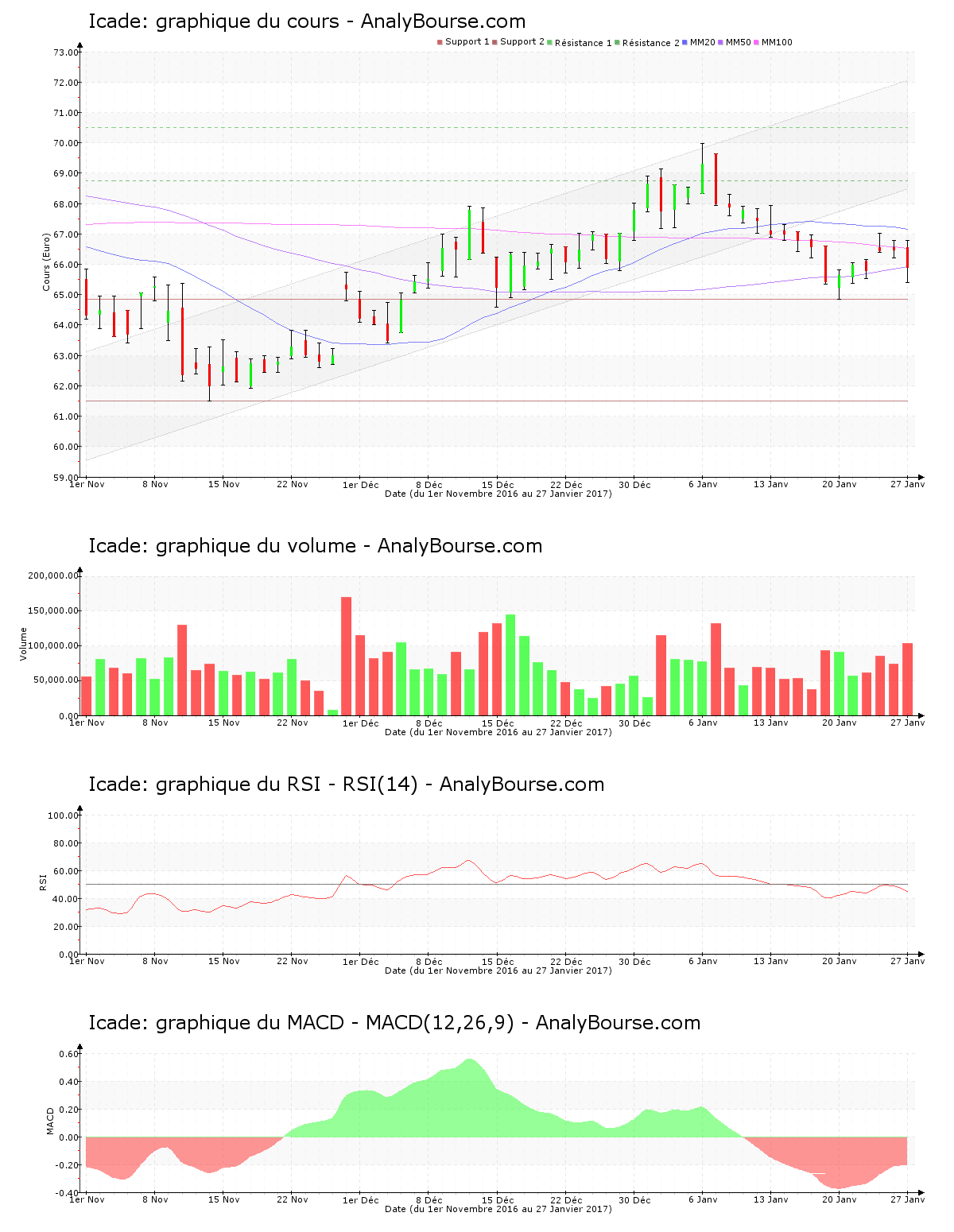 |Le constat est neutre ces dernières séances pour l’action Icade, avec un parcours haussier de 0.38%. Cette dernière atteint en effet seulement la cotation de 65.890 €. Reflétée par un mouvement baissier de 2.02%, Icade subissait au contraire la semaine dernière une pression vendeuse. Le développement du cours le conduit maintenant proche de la résistance des 68.740 €. L’action se localise largement en-dessous de son canal. Elle a en effet franchi la limite inférieure du canal à l’intérieur duquel cette dernière se restreignait depuis quelques temps.