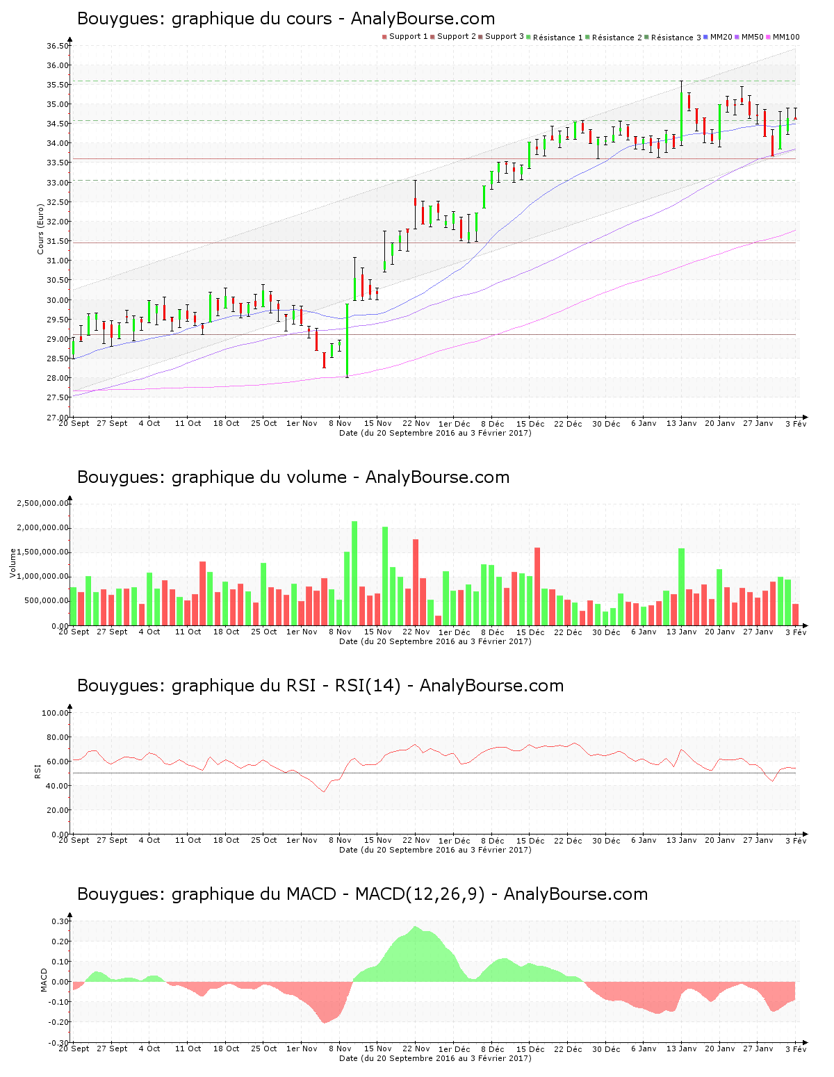 Ces informations constituent une analyse technique de la valeur Bouygues au samedi 4 février 2017. Cette analyse peut être invalidée par des éléments plus récents, et ne constitue en aucune manière une incitation d’achat ou de vente sur les marchés financiers. Le lecteur reste libre et responsable de l’interprétation et de l’usage faits de ces informations.