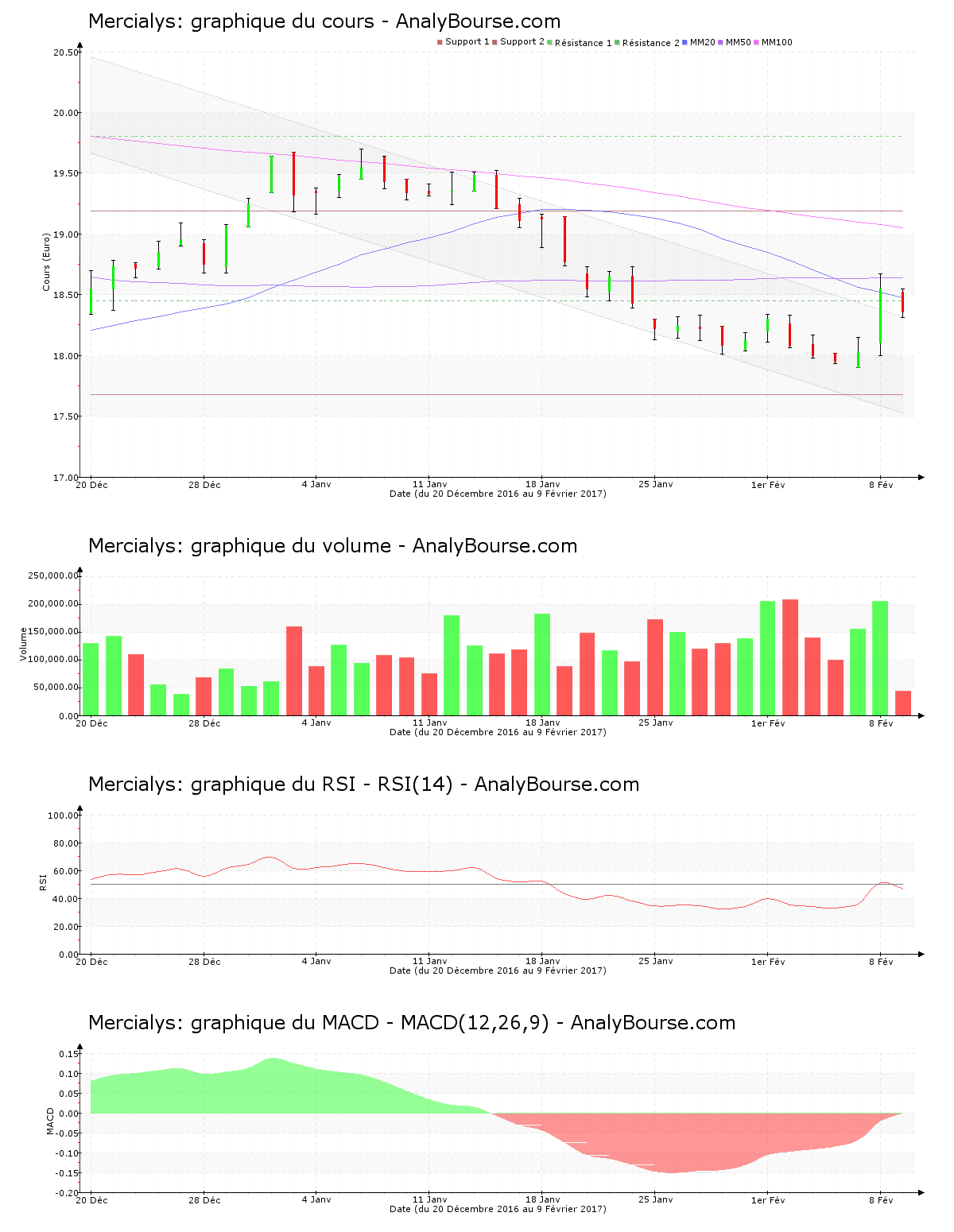 Le RSI est en diminution ce jeudi. Il est passé dans le niveau de vente, cela pourrait caractériser une amorce d’une trajectoire en décroissance sur le long terme pour la valeur Mercialys. En ce qui concerne l’indicateur MACD, on repère que ce dernier est en progression ce jour. Le MACD a basculé en secteur positif ce jeudi, ce qui peut indiquer un prémice d’une trajectoire en augmentation à longue échéance pour la valeur Mercialys.