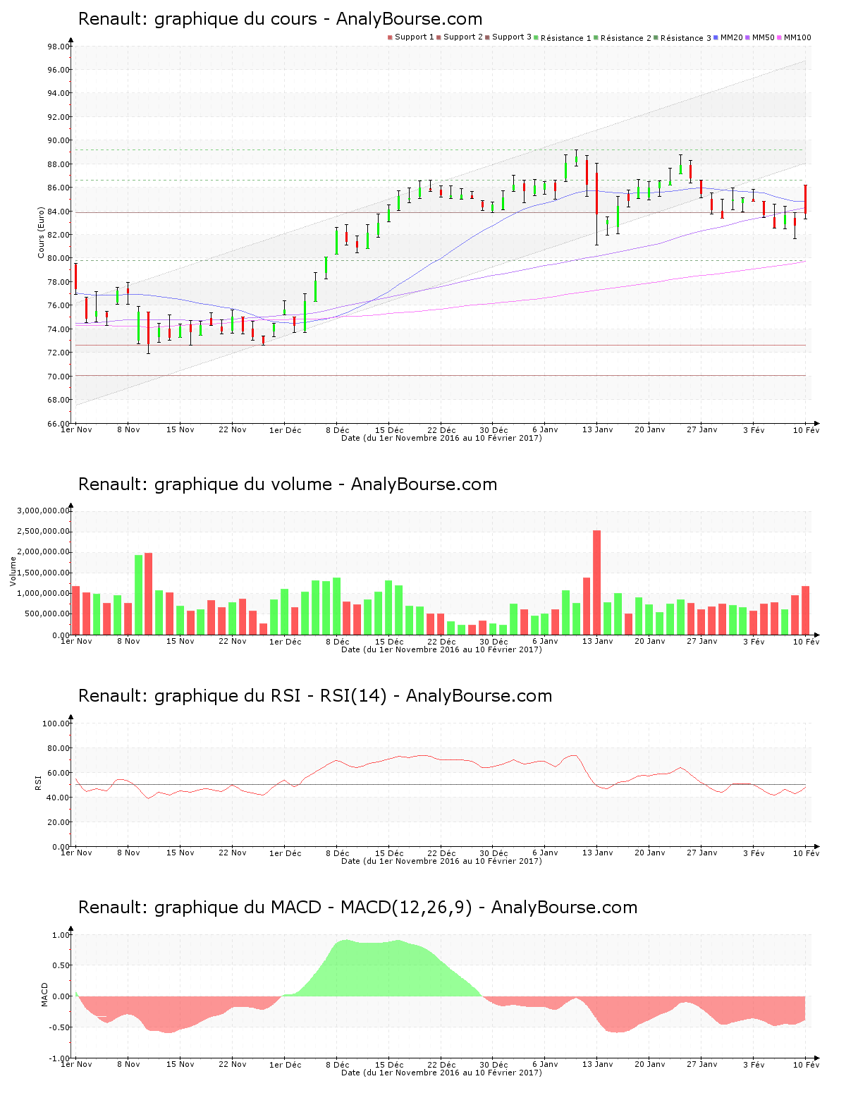 Ces informations constituent une analyse technique de la valeur Renault au samedi 11 février 2017. Cette analyse peut être invalidée par des éléments plus récents, et ne constitue en aucune manière une incitation d’achat ou de vente sur les marchés financiers. Le lecteur reste libre et responsable de l’interprétation et de l’usage faits de ces informations.