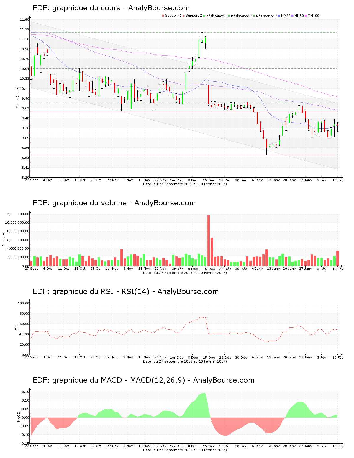 |Illustrée par un cours décroissant de 0.85%, EDF montre encore ces derniers jours une manifeste stabilité. Avec un développement baissier de 0.74%, l’action EDF stagnait déjà la semaine dernière. Elle s’échange par conséquent dorénavant à 9.310 €. La valeur se localise au milieu du canal dans lequel cette dernière se développe ces dernières semaines.