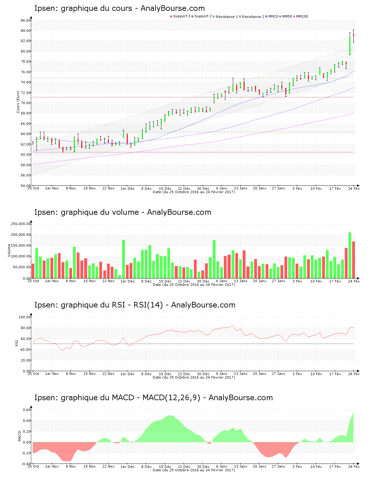 Ces informations constituent une analyse technique de la valeur Ipsen au dimanche 26 février 2017. Cette analyse peut être invalidée par des éléments plus récents, et ne constitue en aucune manière une incitation d’achat ou de vente sur les marchés financiers. Le lecteur reste libre et responsable de l’interprétation et de l’usage faits de ces informations.