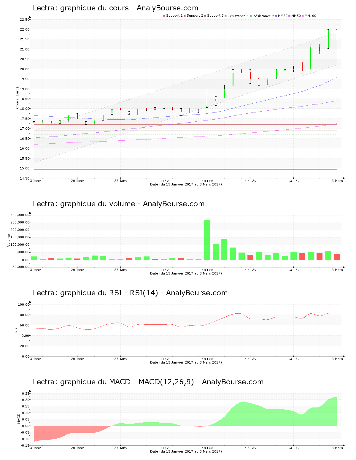 La moyenne mobile sur 20 jours de l’action Lectra se positionne au-delà de la moyenne mobile sur 50 jours, et la moyenne mobile sur 50 jours se situe elle-même au-delà de la moyenne mobile sur 100 jours. Sur une longue période, le parcours de l’action est par conséquent en croissance. Depuis désormais 56 jours, la moyenne mobile sur 20 jours de la valeur Lectra se trouve au-dessus de sa moyenne mobile sur 50 jours. De son côté, concernant l’indicateur MACD, on observe que ce dernier est en vigoureuse croissance ces dernières séances. C’est désormais une tendance du cours en conséquente augmentation que ce dernier révèle sur le moyen terme. Pour terminer, le RSI est relativement stable ces derniers jours. Il se trouve par conséquent toujours au niveau de surachat.